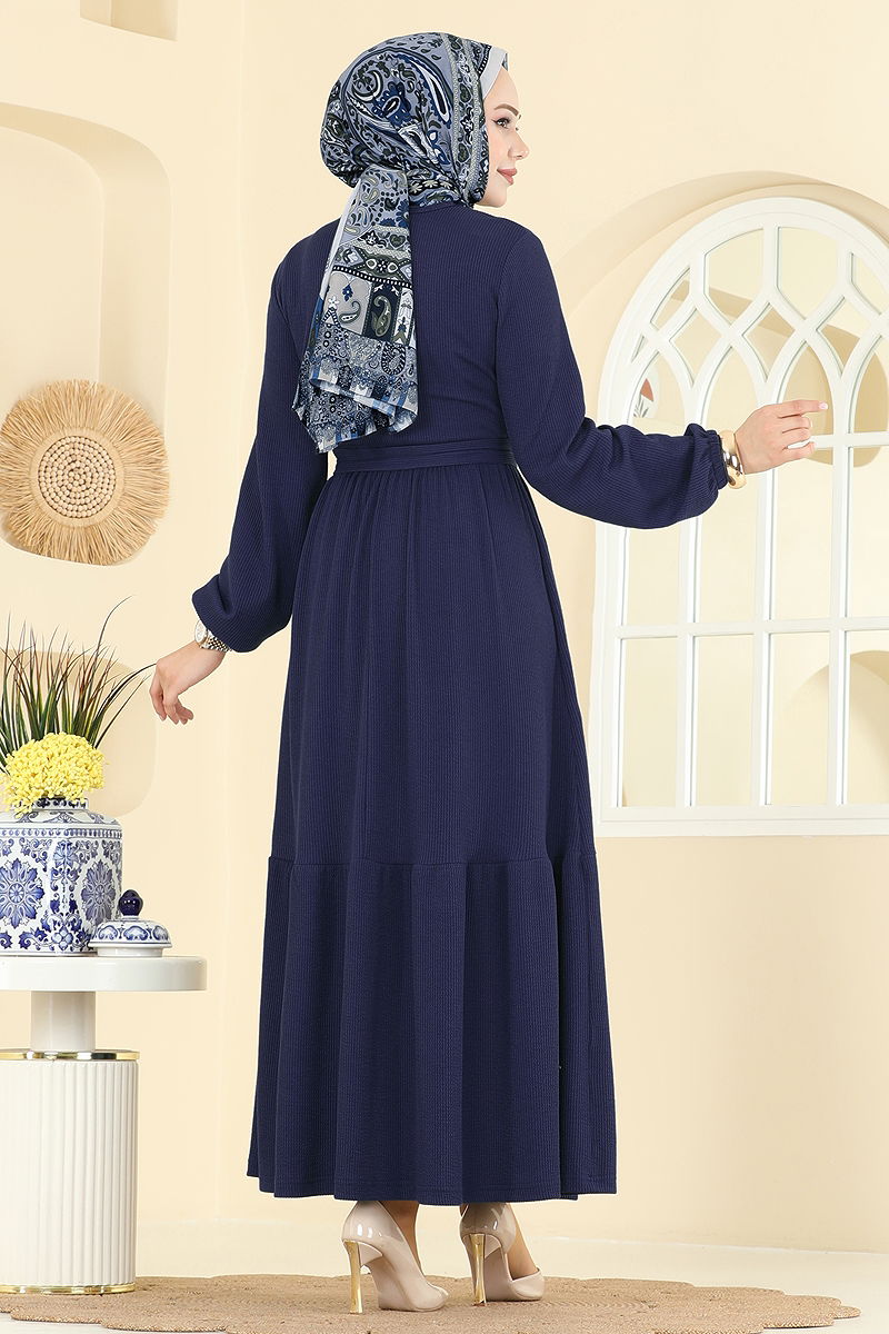 Eteği Katlı Kuşaklı Elbise, özgün tasarımı ile dikkat çeken bir tesettür ürünüdür. Burgu kumaştan üretilmiş olan bu elbise, dört mevsim rahatlıkla kullanılabilir. Ürün, 30 derecede hassas yıkama ile temizlenebilir ve tasarımında bisiklet yaka kullanılmıştır. Manşet lastikli ve astarsız olan bu elbise, belinde dikişli bir yapıya sahiptir. Kemer, iki ucu dikilmiş şekilde tasarlanmış ve orta kısım boş bırakılmış olup, elbiseye dahil edilmiştir ve isteğe bağlı olarak kullanılmayabilir.