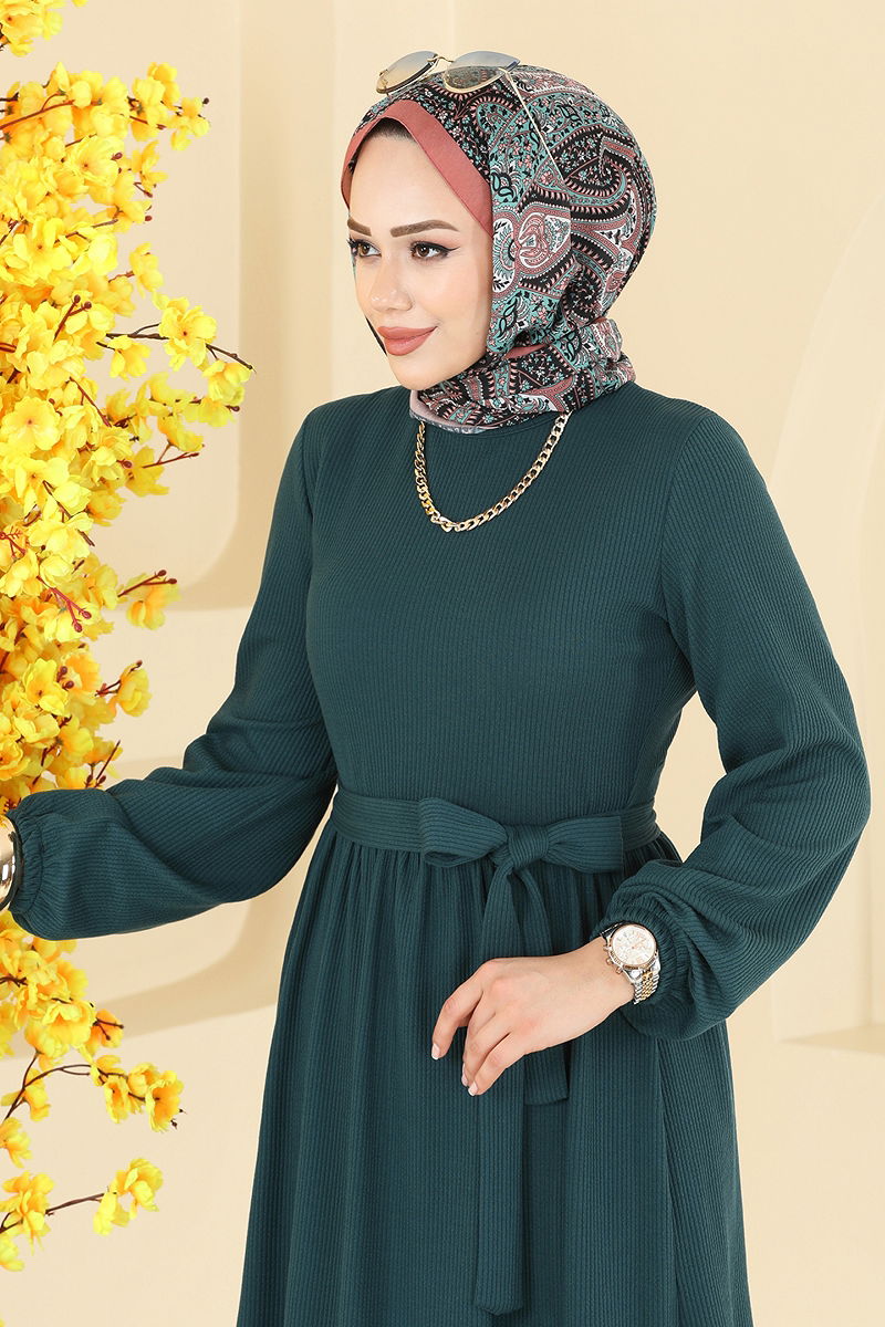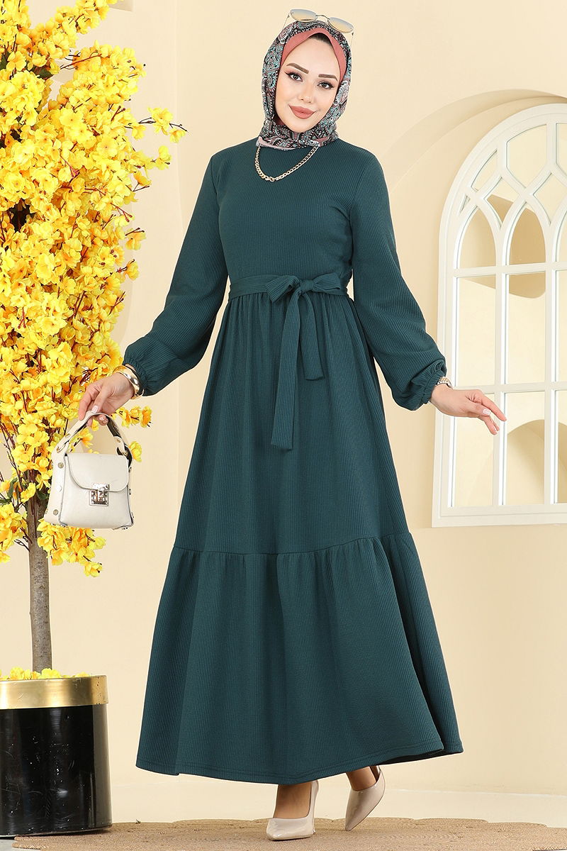 Eteği Katlı Kuşaklı Elbise Petrol