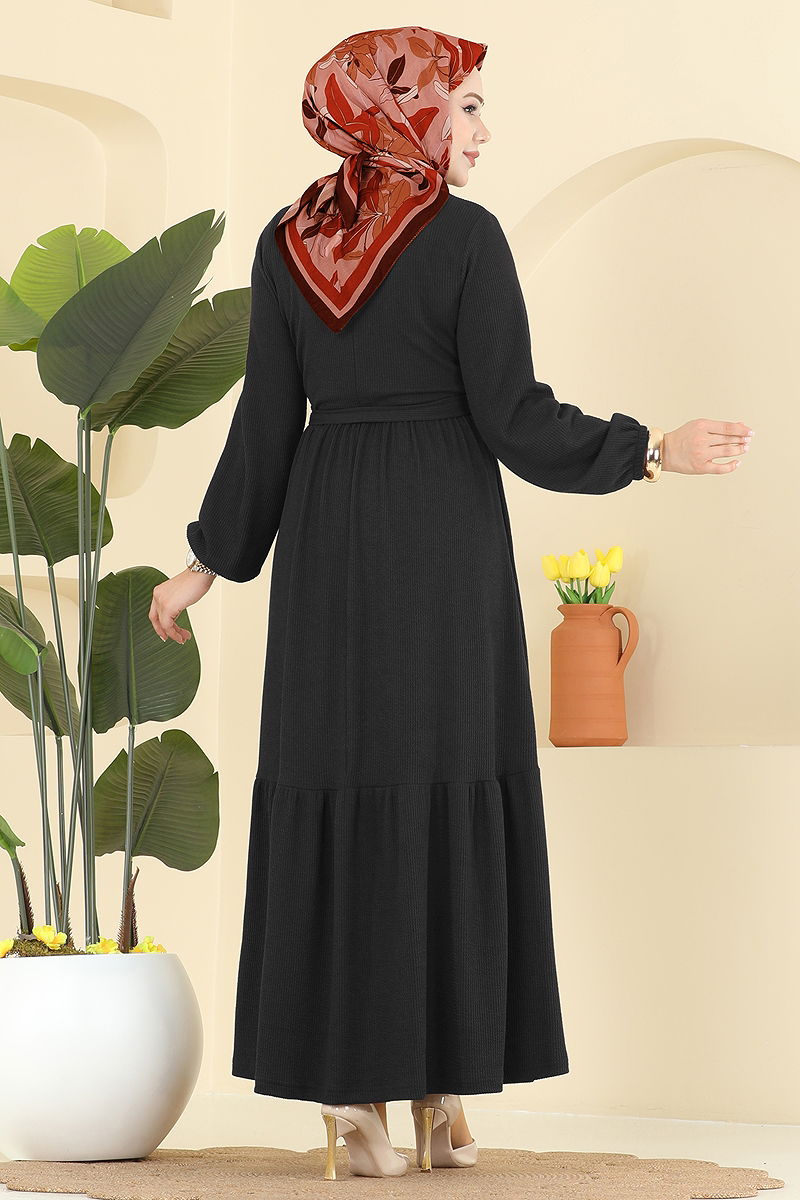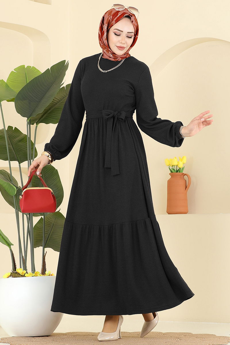 Eteği Katlı Kuşaklı Elbise Siyah