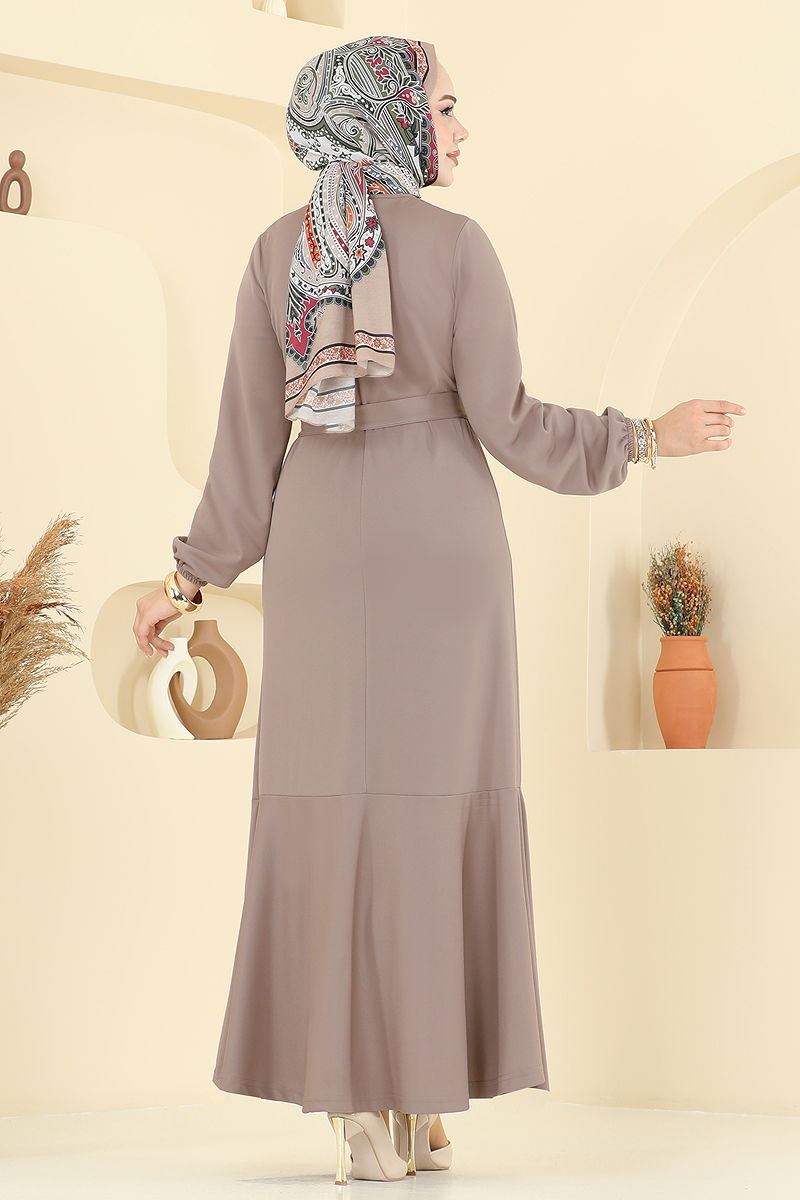 Eteği Katlı Mira Elbise, dört mevsim boyunca rahatça kullanabileceğiniz modern bir tesettür modelidir. 30 derecede hassas yıkama programında yıkanması önerilen bu elbise, dayanıklı Mira kumaştan üretilmiştir. Bisiklet yaka ve astarsız tasarımıyla konfor sunan ürün, standart manşet lastiği ile kolaylık sağlar. Üründe bulunan kemer, iki ucu dikilmiş ve ortası dikişsiz bırakılmış özel bir tasarıma sahiptir. Kemer, elbisenin şıklığını artırırken, isteğe bağlı olarak çıkarılabilir. Klasik ve şık görünümüyle her ortamda öne çıkar.