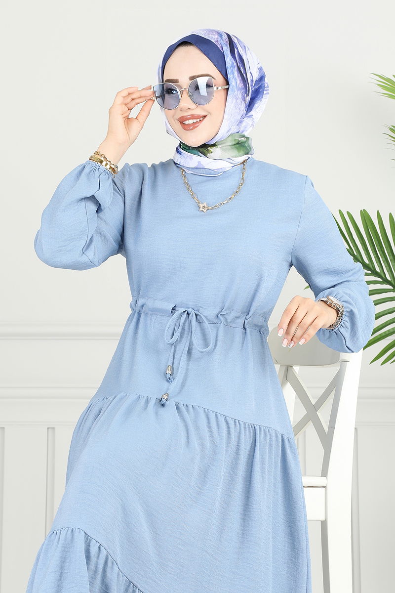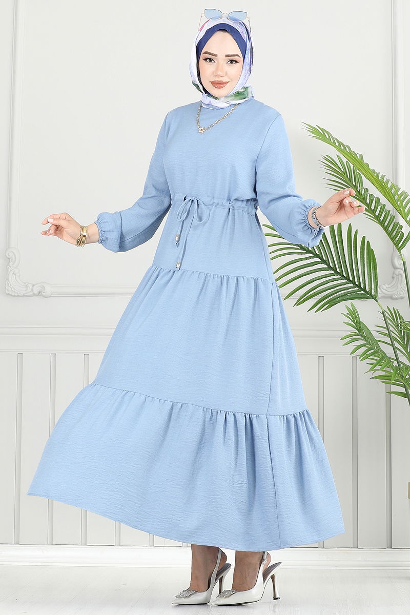 The Layered Skirt Sofia Dress is specially designed for modest dress. Suitable for all seasons, this model can be washed at 30 degrees on a delicate setting. Made from Sofia linen fabric, it is durable and elegant. It has a crew neck and is unlined for a modern touch. Featuring a button at the back and a drawstring waist, the dress increases comfort with its elasticated cuffs. The product displayed on the model is size 38, ensuring you remain stylish in every setting.