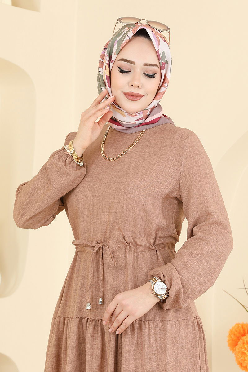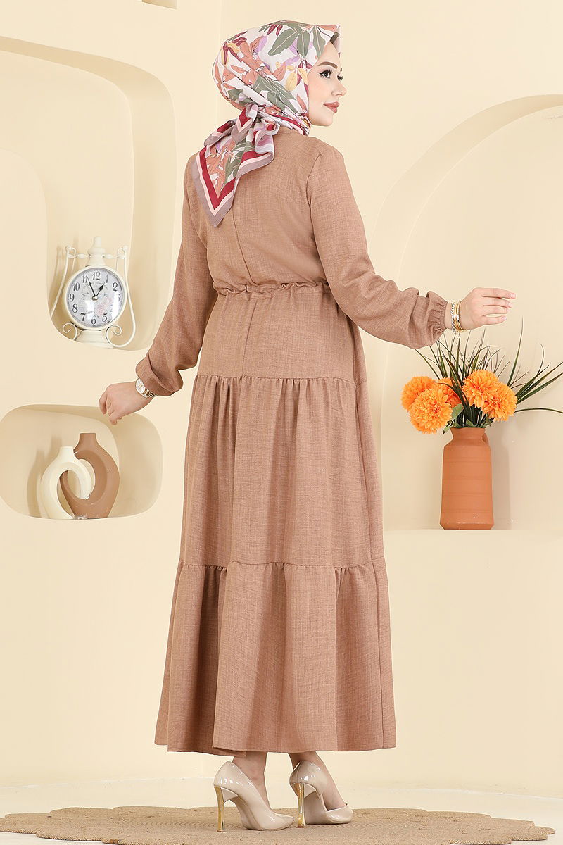 The Layered Skirt Sofia Dress stands out with its unique design and layered skirt structure. This modest dress, suitable for all seasons, is made of Sofia linen fabric and features a round neck design. Its liner-free structure and accessible button detail on the back make it easy to wear. It offers a comfortable fit with its elastic cuffs and drawstring waist design. Recommended to be washed at 30 degrees with gentle care. The Sofia Dress, a must-have in the wardrobe of every woman who wants to feel like a princess, offers elegance and comfort together.