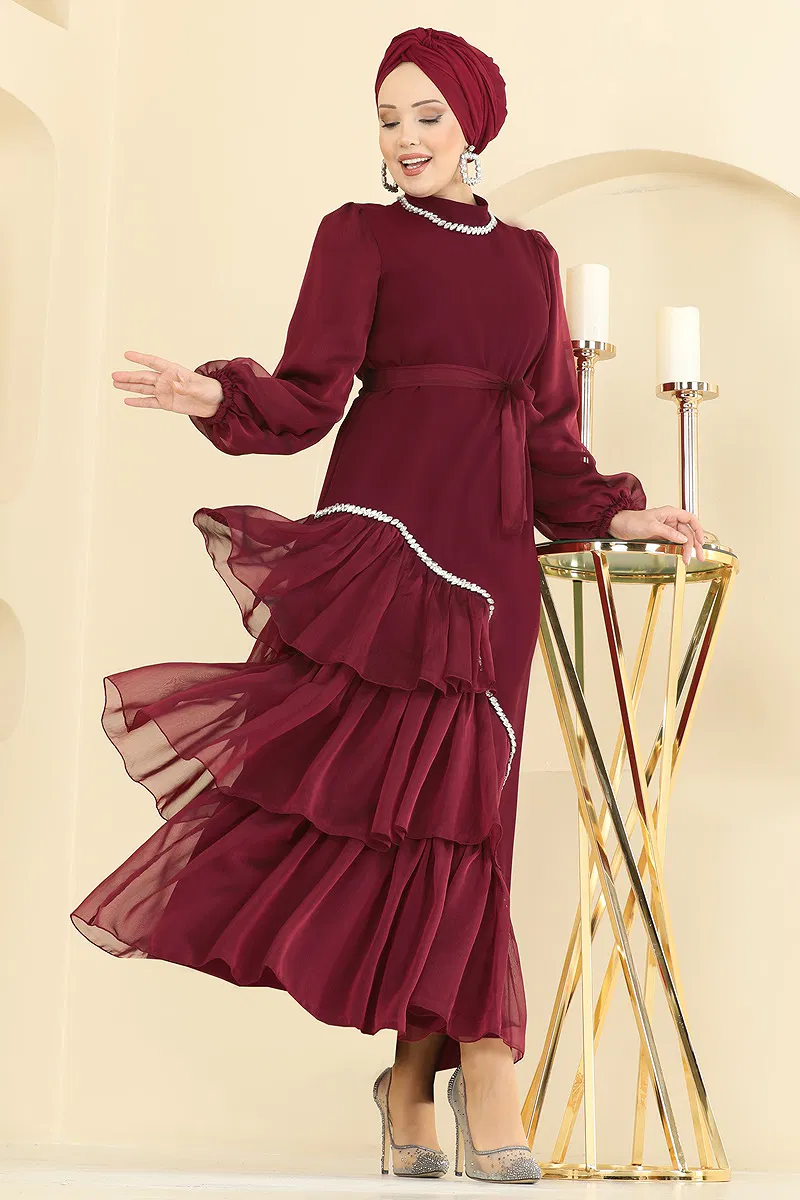 Eteği Katlı Taşlı Abiye 5735EDF311 Bordo