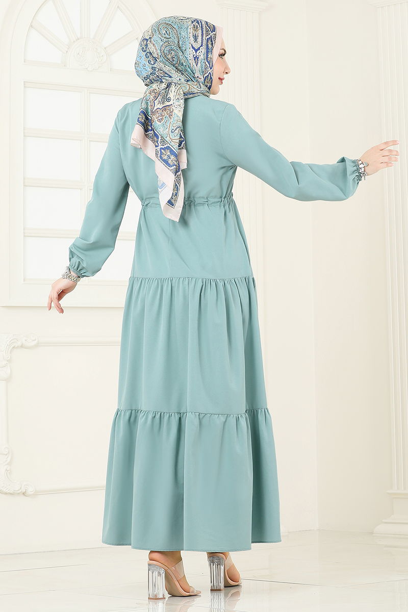 The Layered Skirt Tericot Dress combines elegance and comfort, making it a perfect all-season choice for modest wear. Washable at 30 degrees on a gentle cycle, this dress is crafted from tericot fabric. It features a crew neck, a lining-free design, and a back button closure that offers both modernity and practicality. With a drawstring waist and elastic cuffs, this dress brings together ease and style. The product shown on the model is size 38.