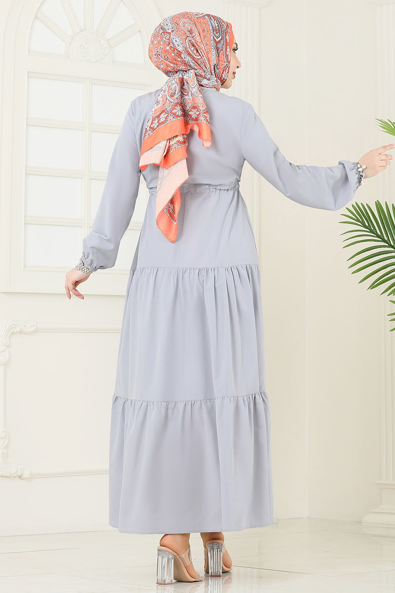 Eteği Katlı Terikoton Elbise Gri