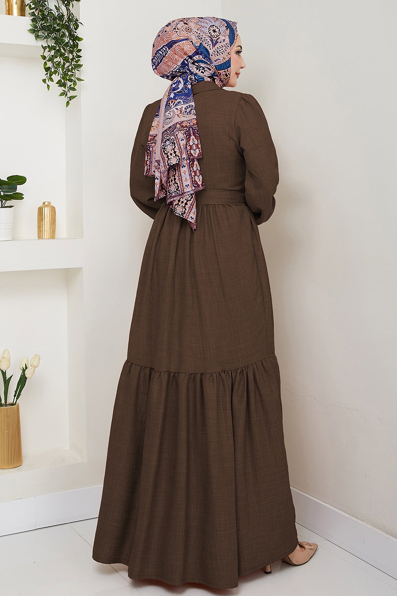 Eteği Fırfırlı Tesettür Elbise, dört mevsim rahatlıkla kullanabileceğiniz zarif bir seçenektir. Sofia keten kumaştan üretilmiş bu elbise, hassas yıkama ile 30 derecede yıkanabilir. Gömlek yakası ve yarım düğmeli ön tasarımı ile modern ve şık bir görünüm sunar. Ürün astarsız olup, manşetleri lastiklidir. Elbisenin kemer detayı iki ucu dikilmiş olup orta kısmı dikişsizdir, isteğe bağlı kullanılabilir. Boyut olarak, modelin üzerindeki 38 bedendir.