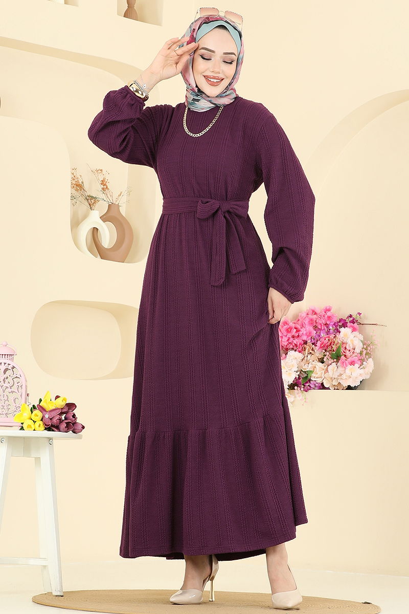 Eteği Katlı Tesettür Elbise Mürdüm