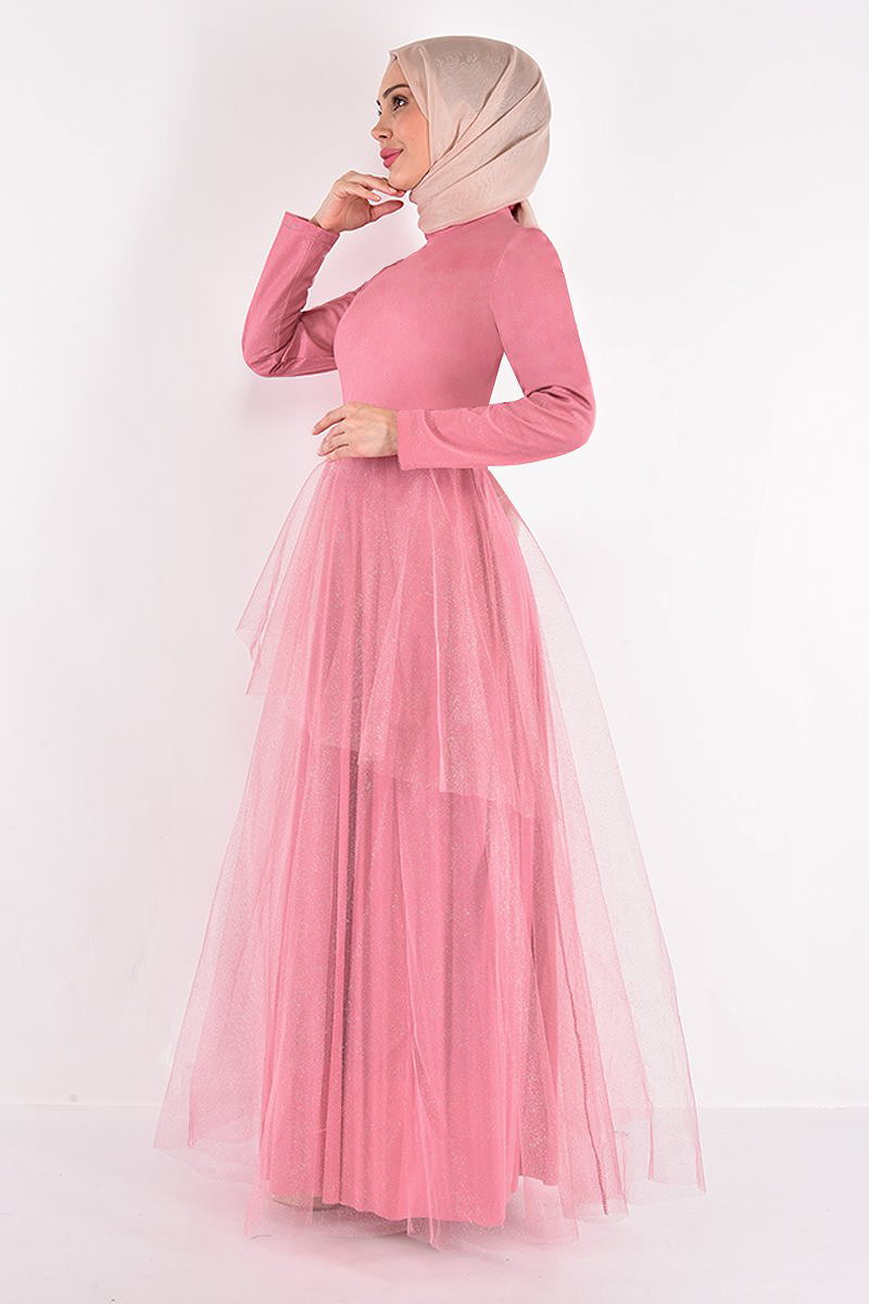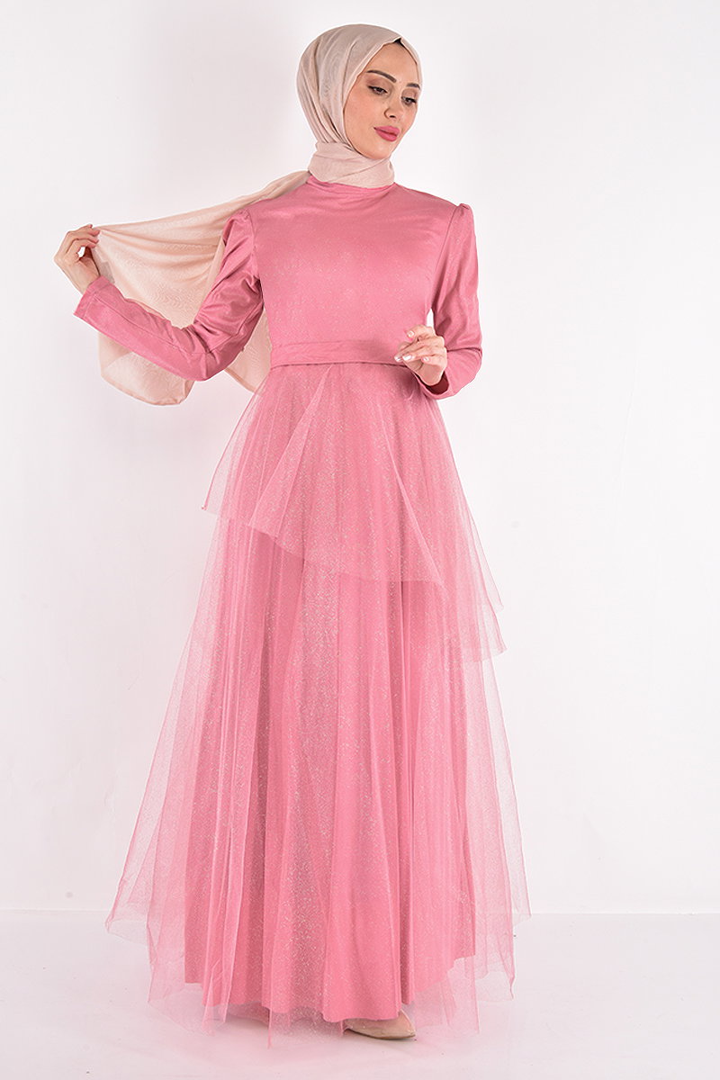 Eteği Katlı Tül Abiye Pudra