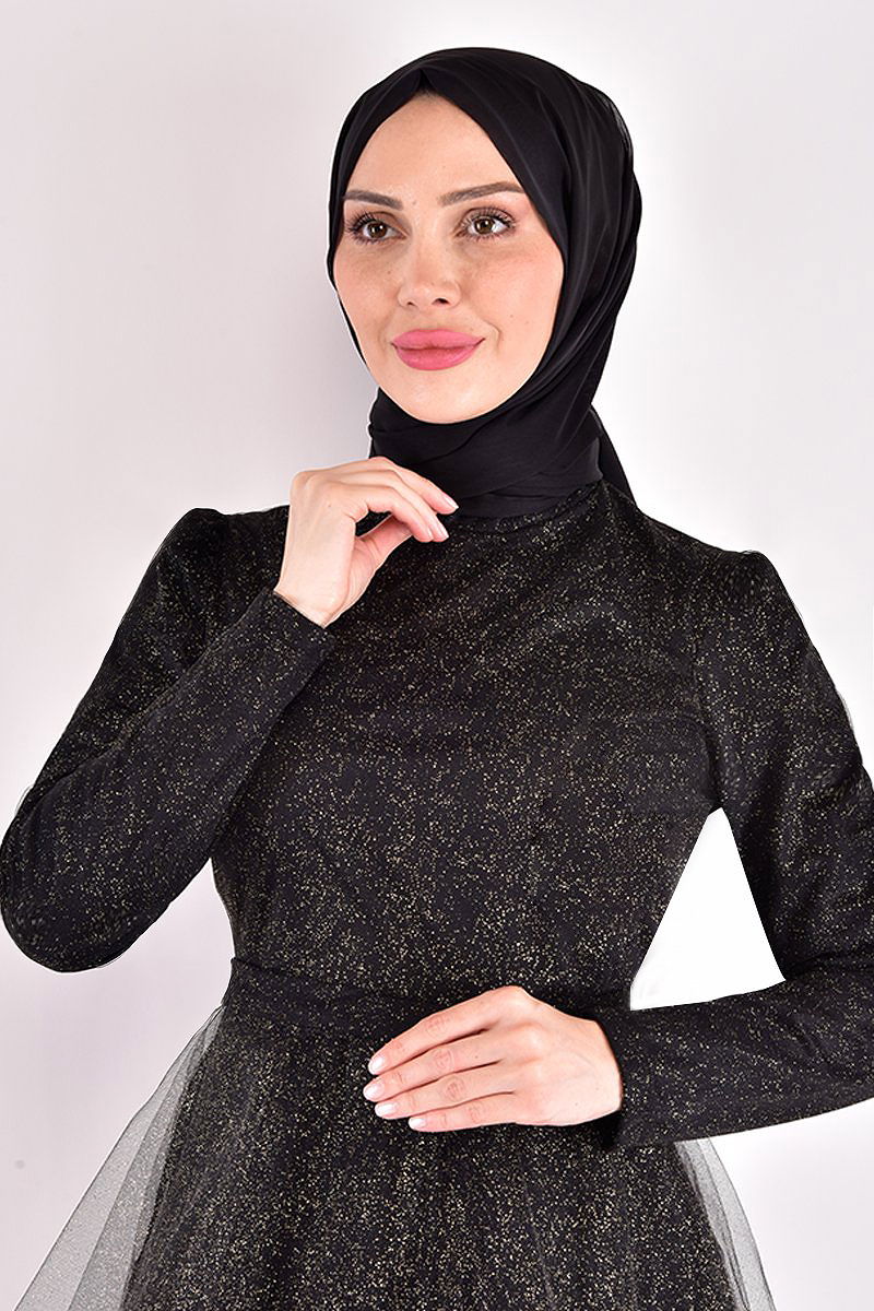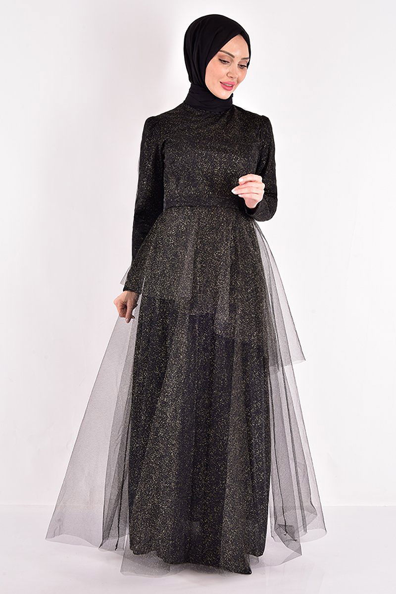 Eteği Katlı Tül Abiye Siyah