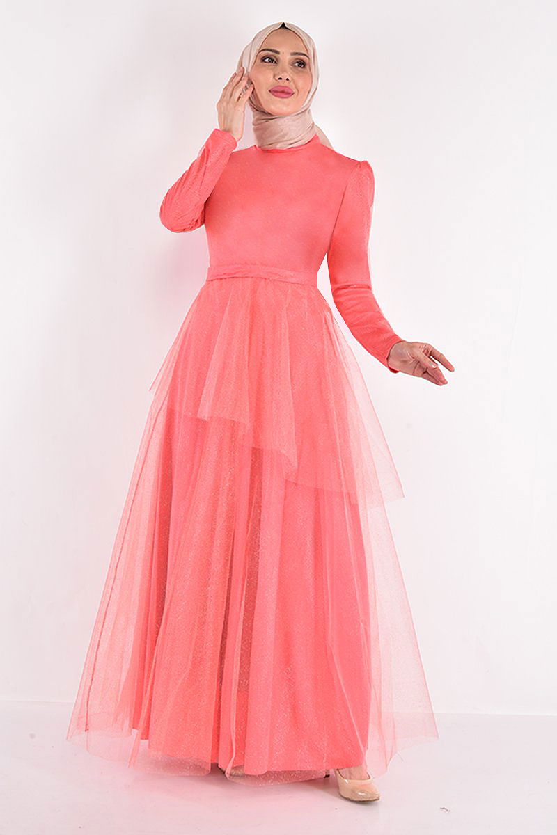 Eteği Katlı Tül Abiye ASM2471-M Somon