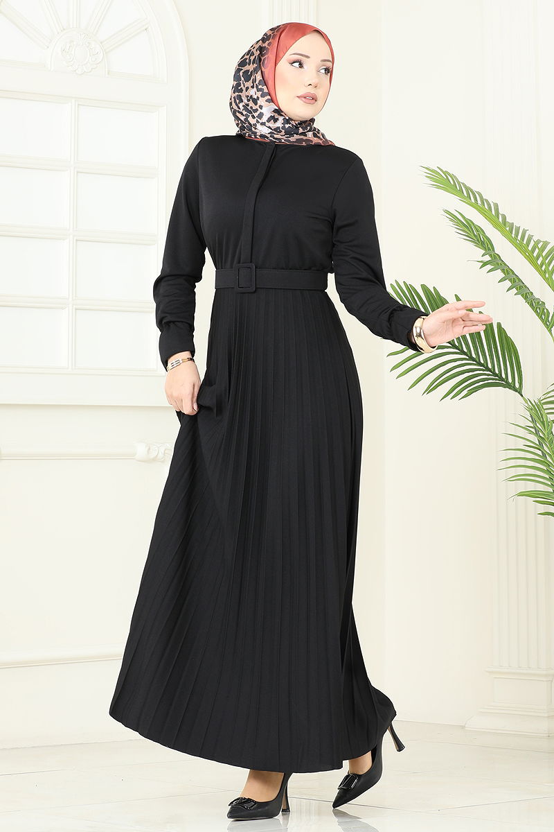 Eteği Piliseli Kemerli Elbise 5730EDF311 Siyah