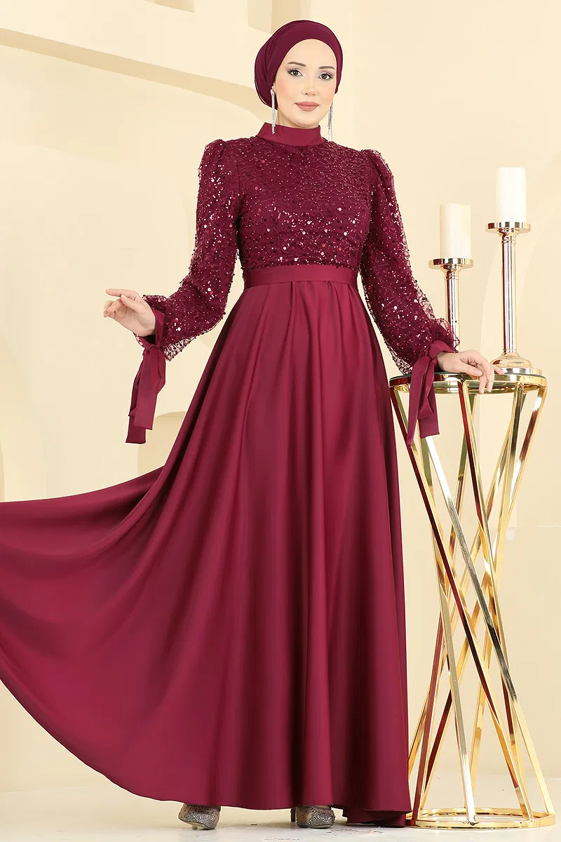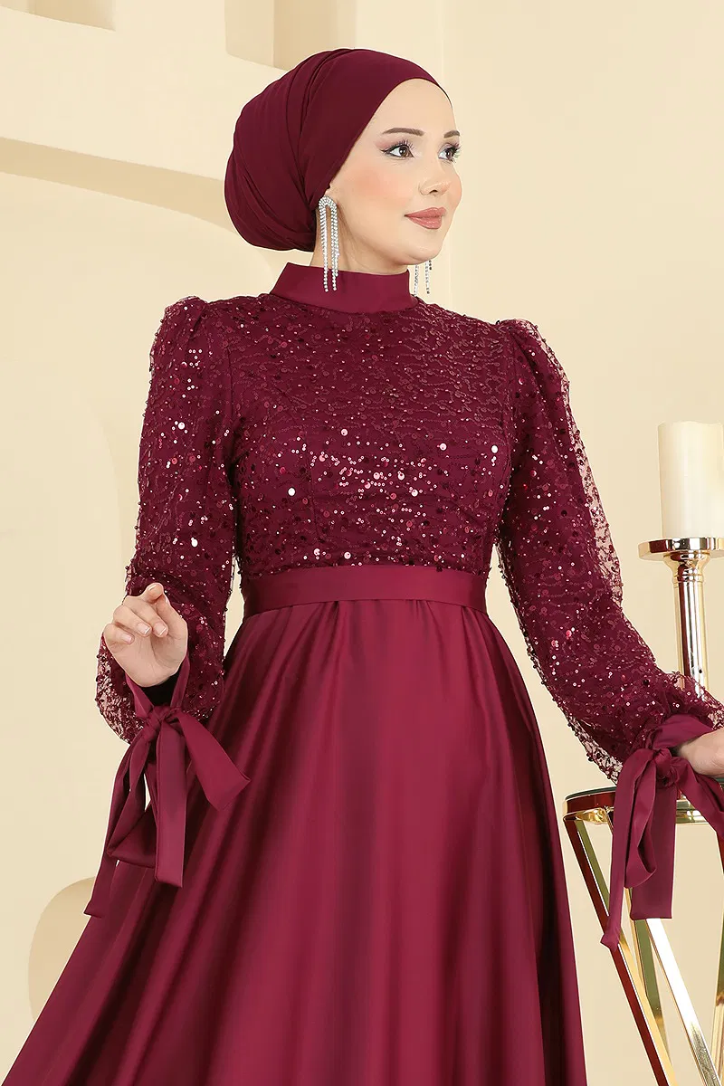 Eteği Saten Pullu Abiye 5748EDF311 Açık Bordo