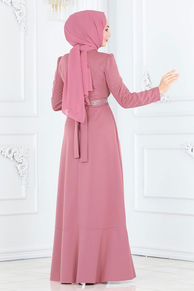 Eteği Volanlı Abiye Elbise Açık Gül Kurusu