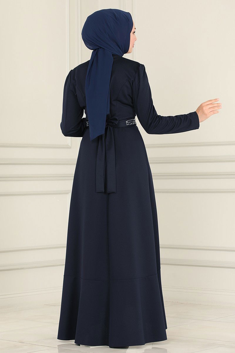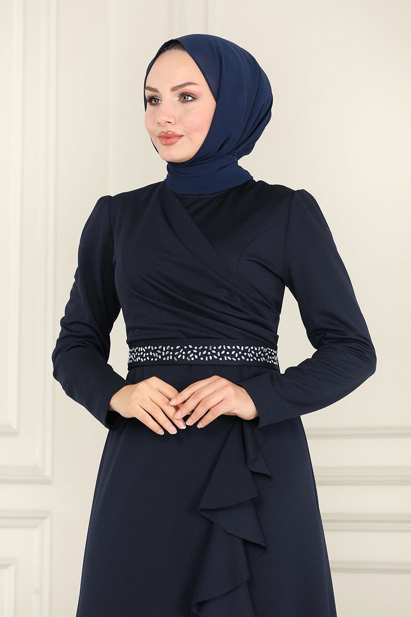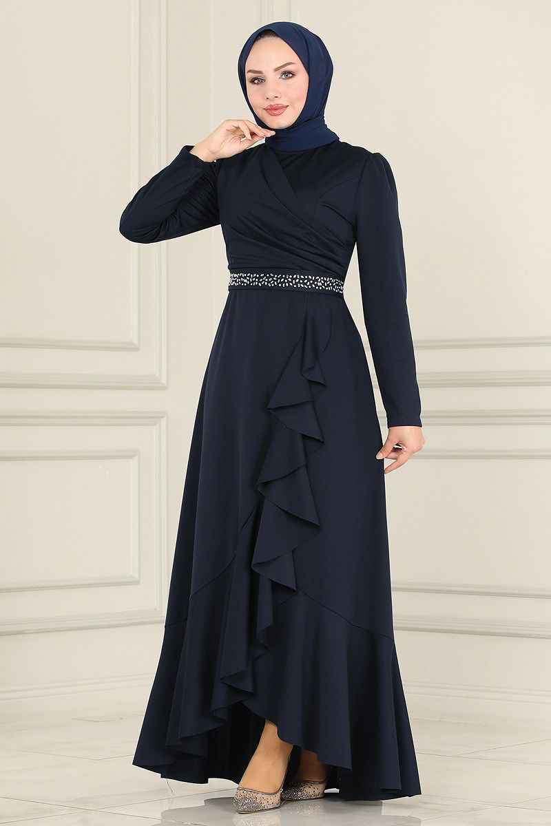 Eteği Volanlı Tesettür Abiye is a TESSEE, four-season model. It should be dry cleaned only. It is made of Dabıl fabric. The product has a bike collar. It is lining-less and has a back zip. (Product on the model is size 38.) The stones are pasted.