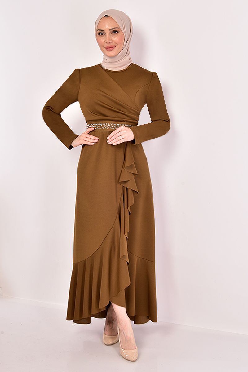 Eteği Volanlı Elbise KBR5078-M Açık Taba