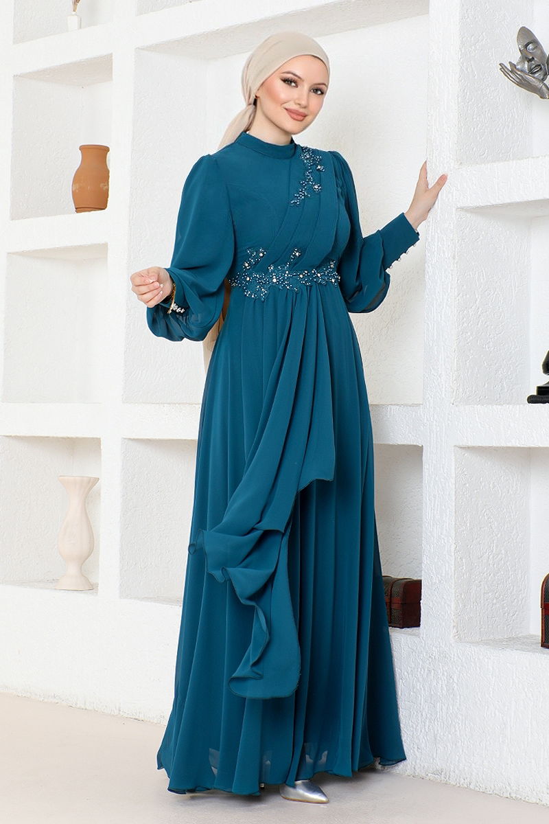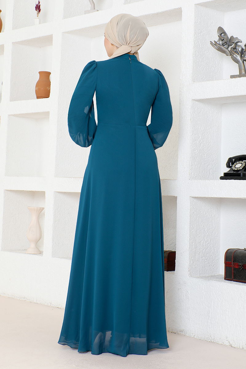 Eteği Volanlı Tesettür Abiye ABY5652-M Petrol