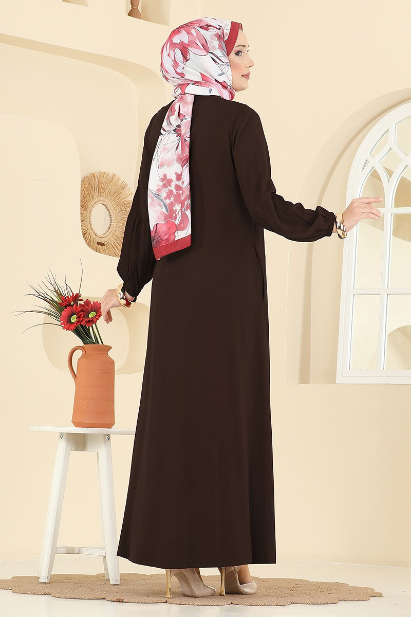 Eteği Volanlı Tesettür Elbise Kahve