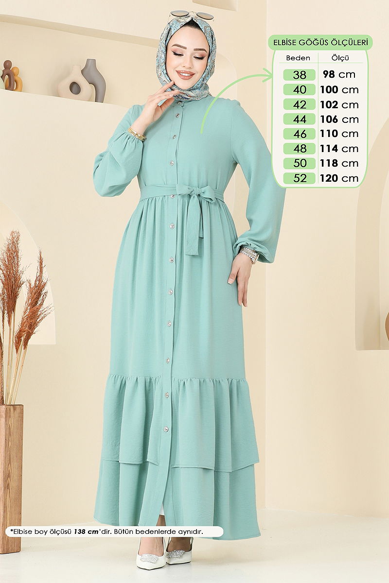 Etek Ucu Katlı Elbise, model tesettür ürünü olup dört mevsim rahatlıkla kullanılabilir. Özel Aerobin kumaşı sayesinde, hassas yıkama ile 30 derecede yıkanabilir, uzun ömürlüdür. Şık bir görünüm sunan yarım Hakim yaka ve ön düğme detayları ile pratik bir kullanım sağlar. Astarsız tasarımıyla hafif ve konforludur. Yerleşik kemer, dalgalanmayı önler ve zarif bir siluet çizer. Kemer, isteğe bağlı olarak çıkarılabilir. Manşetler lastiklidir, hareket özgürlüğü sunar.