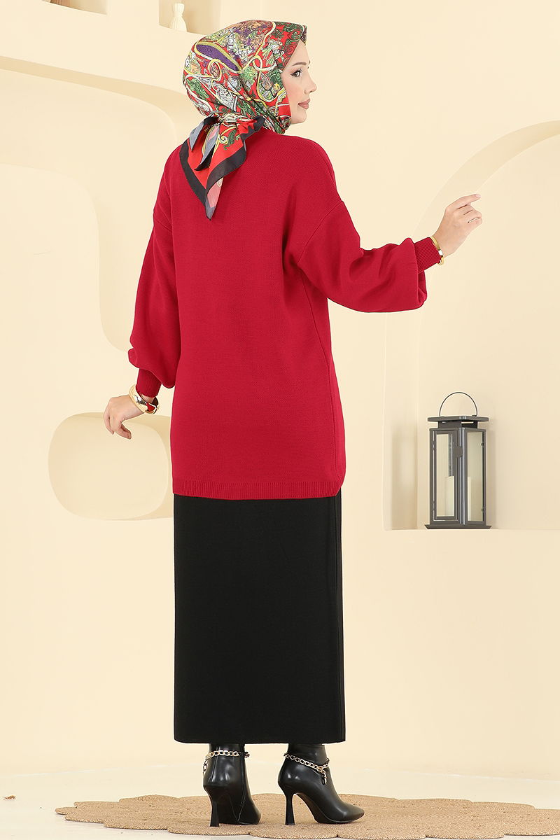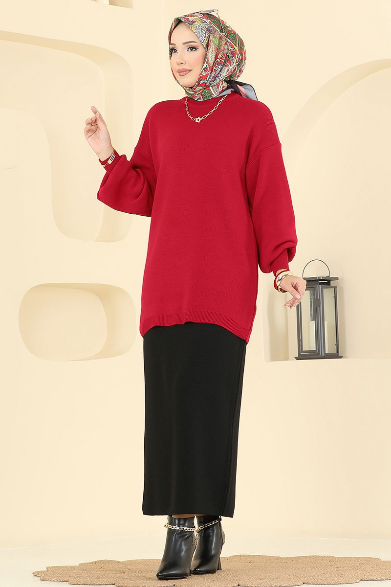 Etekli Triko Takım KOMBİN modelimiz, tesettür giyim tarzınıza uygun, sonbahar ve kış mevsiminde rahatlıkla kullanabileceğiniz özel bir üründür. Üretiminde yüksek kaliteli triko kumaş kullanılmıştır ki bu sayede uzun ömürlüdür. Hassas yıkama ile 30 derecede yıkanabilme özelliğine sahiptir. Model bisiklet yaka tasarıma sahiptir ve astarsızdır. Etek kısmı lastikli bel tasarımına sahiptir, bu sayede konforlu bir kullanım sunar. Ürün standart beden olarak model üzerinde sunulmuştur.