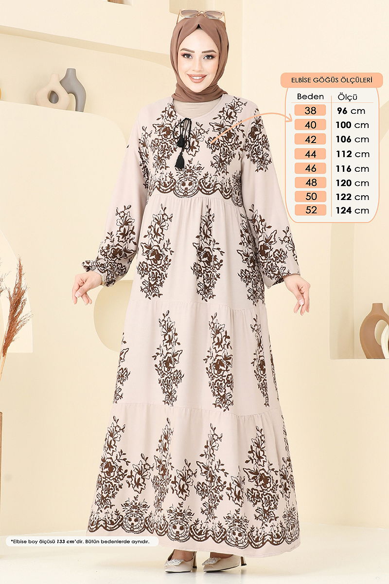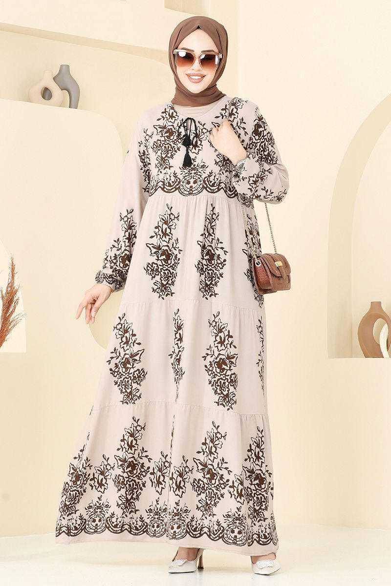 Etnik Desen Tesettür Elbise 4081ZNN863 Taş