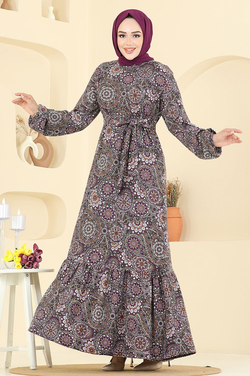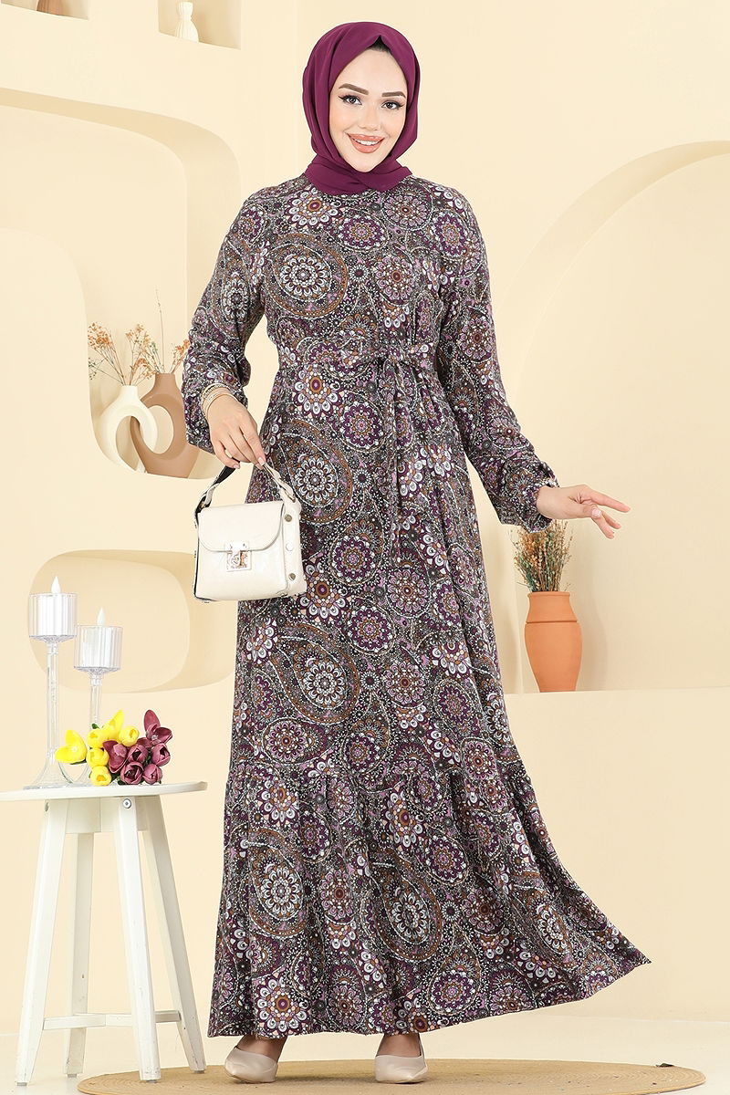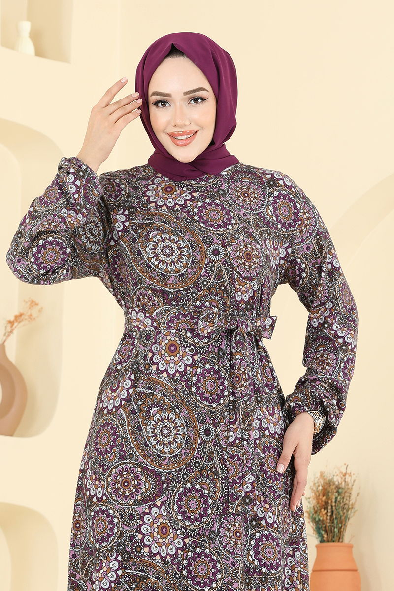 Etnik Desen Tesettür Elbise Desen 1 Mürdüm