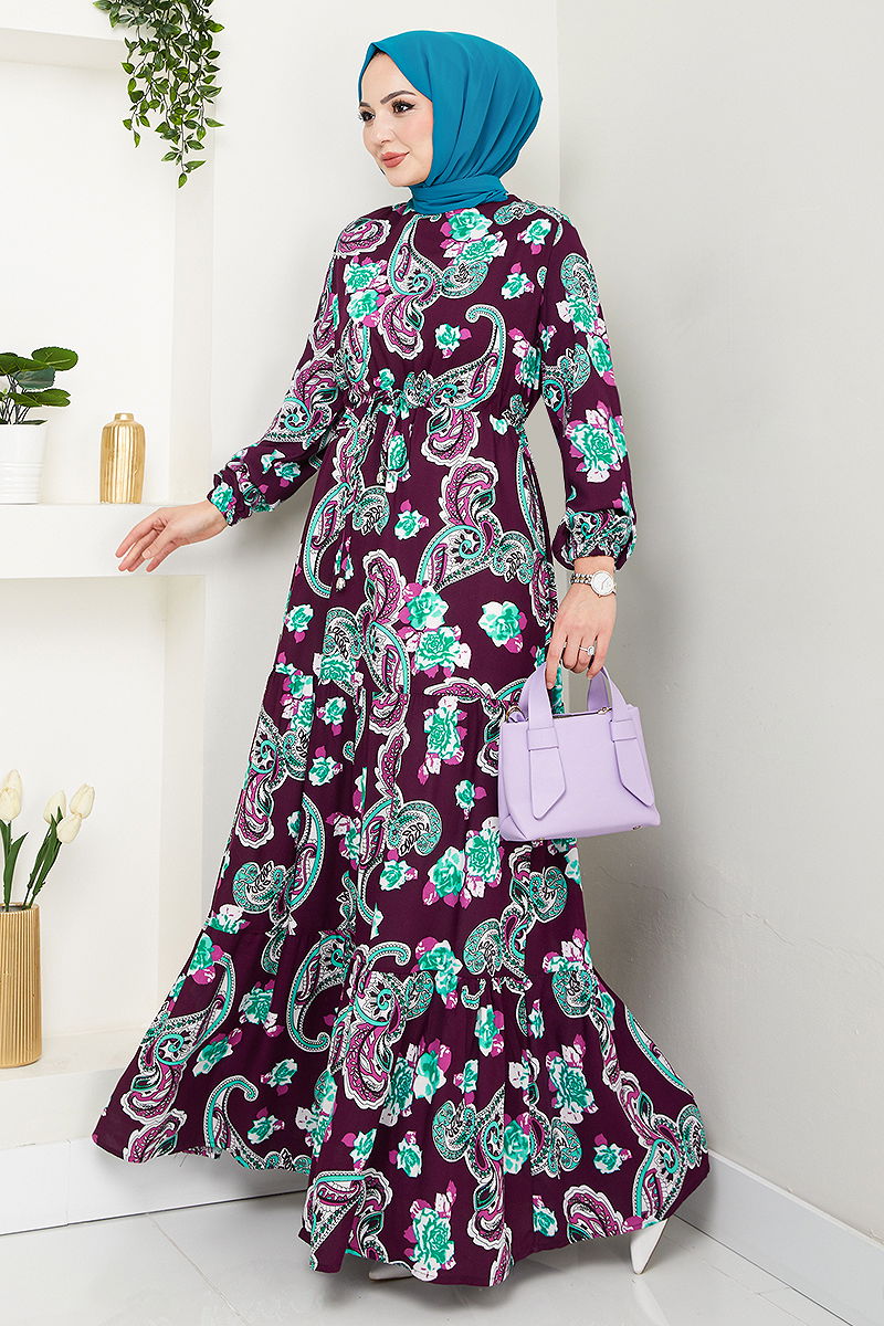 Etnik Desen Tesettür Elbise 823OZR1047-M Mürdüm