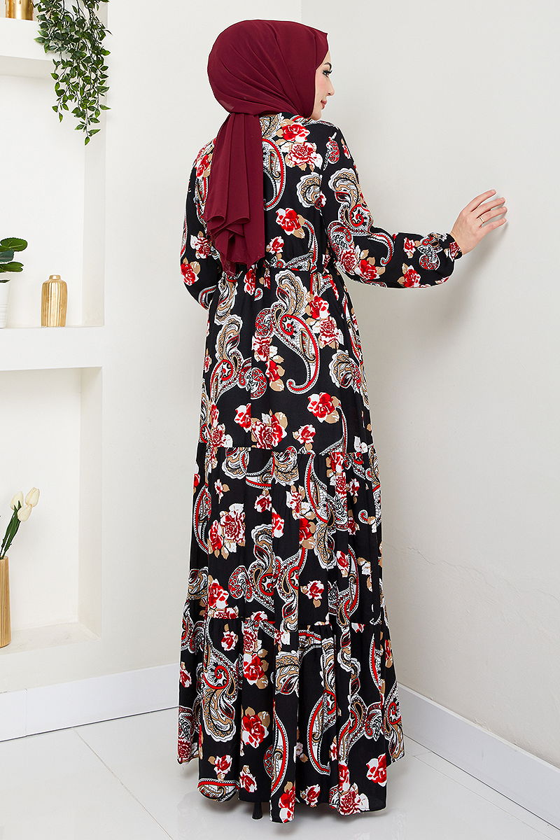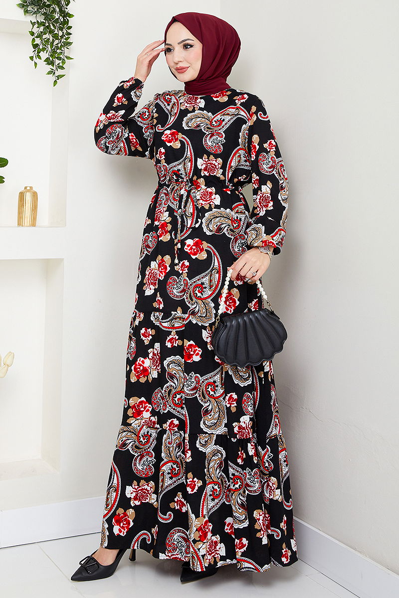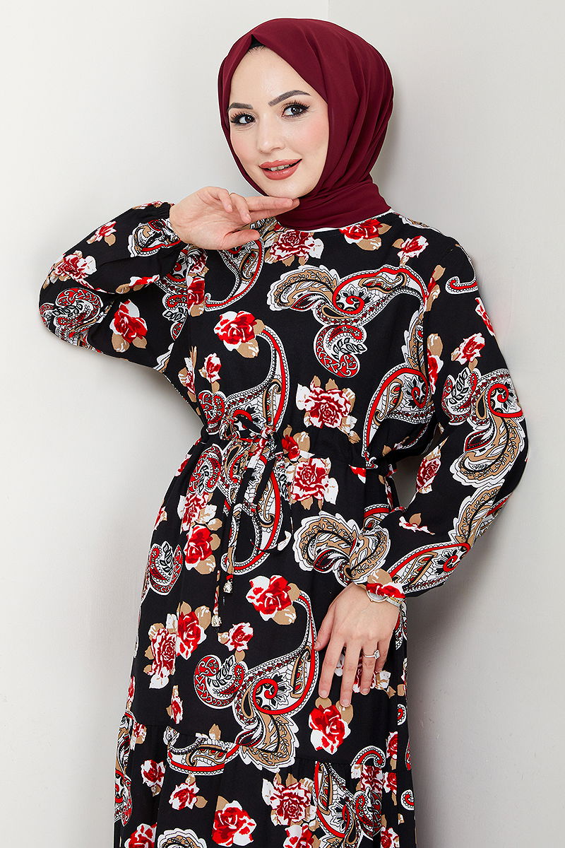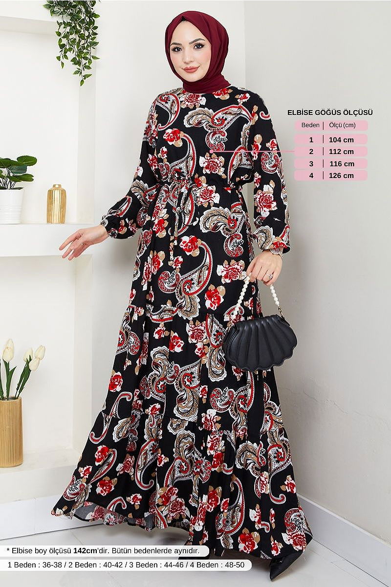 Etnik Desen Tesettür Elbise, dört mevsim rahatlıkla giyilebilen ve etnik desenleri ile göz alıcı bir tasarıma sahip tesettür elbisedir. Viskon kumaştan üretilmiş olan bu elbise, bisiklet yaka ve manşet lastik detayları ile şıklığı konforla buluşturuyor. Ürün astarsızdır ve sırttan fermuarlıdır. Elde yıkama önerilir. 1 beden örneği ile sunulan bu elbise, beli bağcıklı tasarımıyla da kullanıcıya uyum sağlama konusunda esneklik sunar.