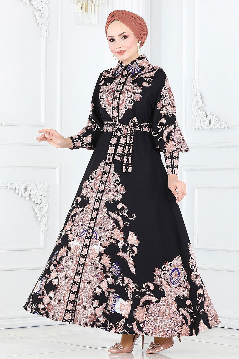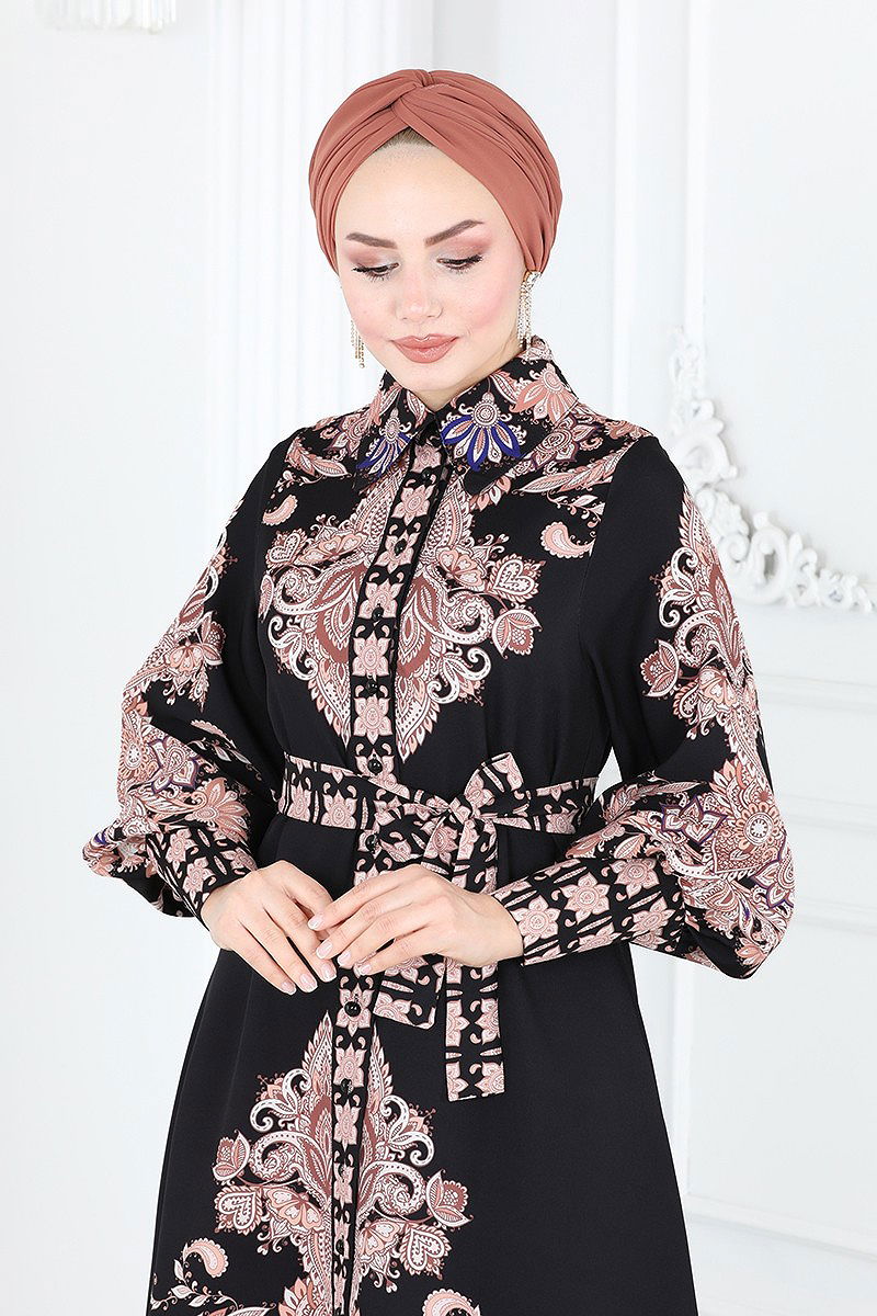 Etnik Desenli Atlas Elbise 21719JNF844 Siyah