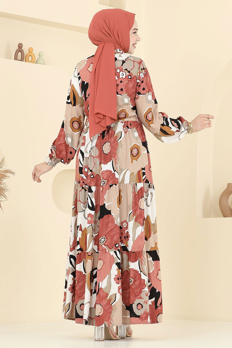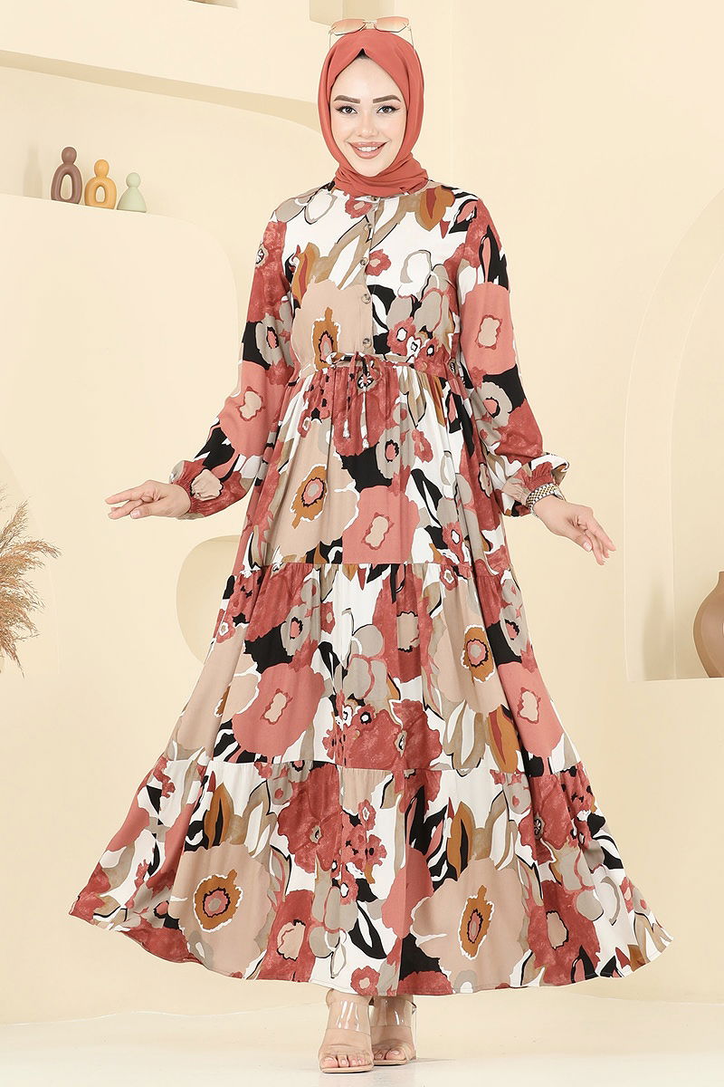 Bu özel tasarım Etnik Desenli Viskon Elbise, dört mevsim boyunca rahatlıkla kullanılabilir. Viskon kumaştan üretilen bu model, elde yıkama ile temizlenmelidir. Yarım hakim yakası ve ön kısmında yer alan yarım düğmeler ile modern ve şık bir görünüm sunar. Astarsız yapısı ve beli bağcıklı tasarımı ile konfor sunan bu elbise, manşet lastikli kolları ile de pratik bir kullanım sağlar. Tesettür giyim tarzına uygun bu elbise, her ortamda şıklığınızı korumanız için idealdir.