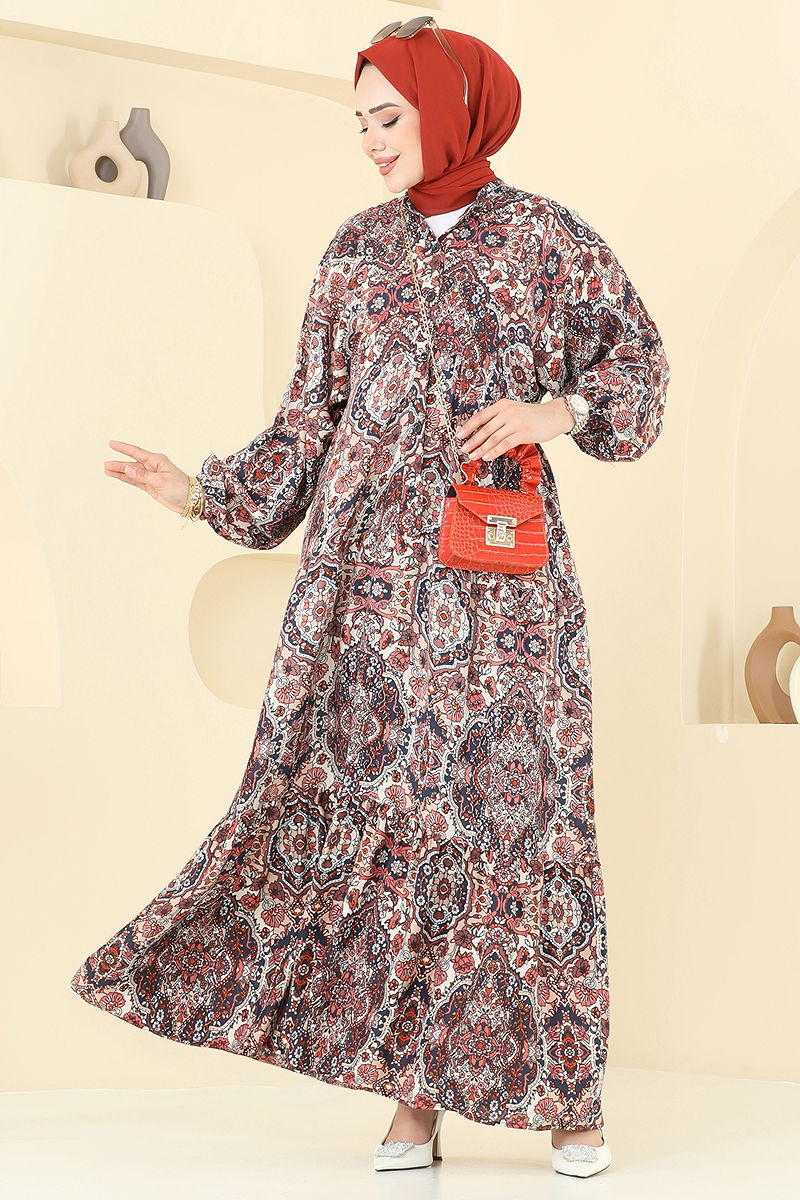 Etnik Desenli Viskon Elbise, dört mevsim rahatlıkla kullanabileceğiniz tesettür bir modeldir. Elde yıkama önerilen bu ürün, viskon kumaştan üretilmiş olup, V yaka tasarımına sahiptir. Pratik kullanım için yarı düğmeli ön kısma ve manşet lastikli kollarıyla dikkat çeker. Astarsız yapısı ile hafif ve rahattır. Modelin üzerindeki ürün 1 bedendir.