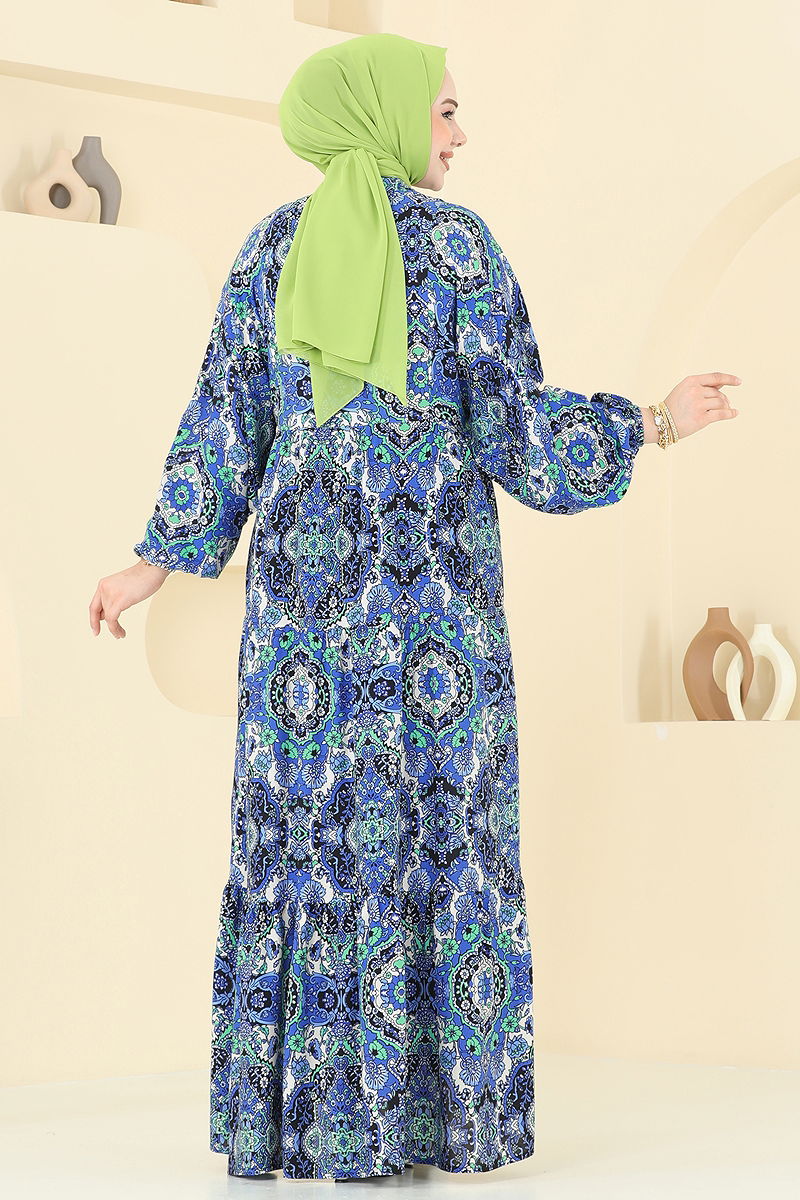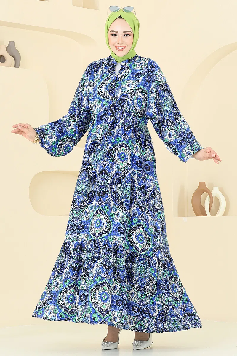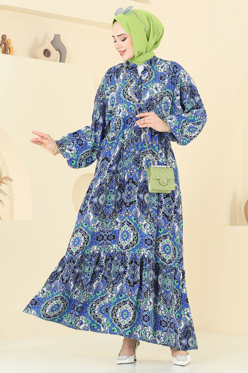 Etnik Desenli Viskon Elbise Saks