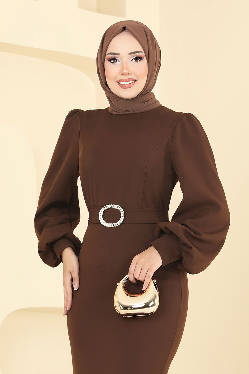 Puff Sleeve Mermaid Evening Dress is a striking choice for your special occasions! Designed in a modest style, this dress can be comfortably worn in all seasons. Machine washable at 30 degrees with delicate care, this garment is made from durable Dabil fabric. It features a bicycle neck and a back zipper for a modern look. Its liner-free design offers a light and comfortable experience. The included belt, with specially sewn ends to prevent waving, creates an elegant silhouette. The puff sleeves add a touch of elegance. The length of the dress is 165 cm, with a chest of 80 cm, waist of 66 cm, hips of 100 cm. The product displayed is a size 38.
