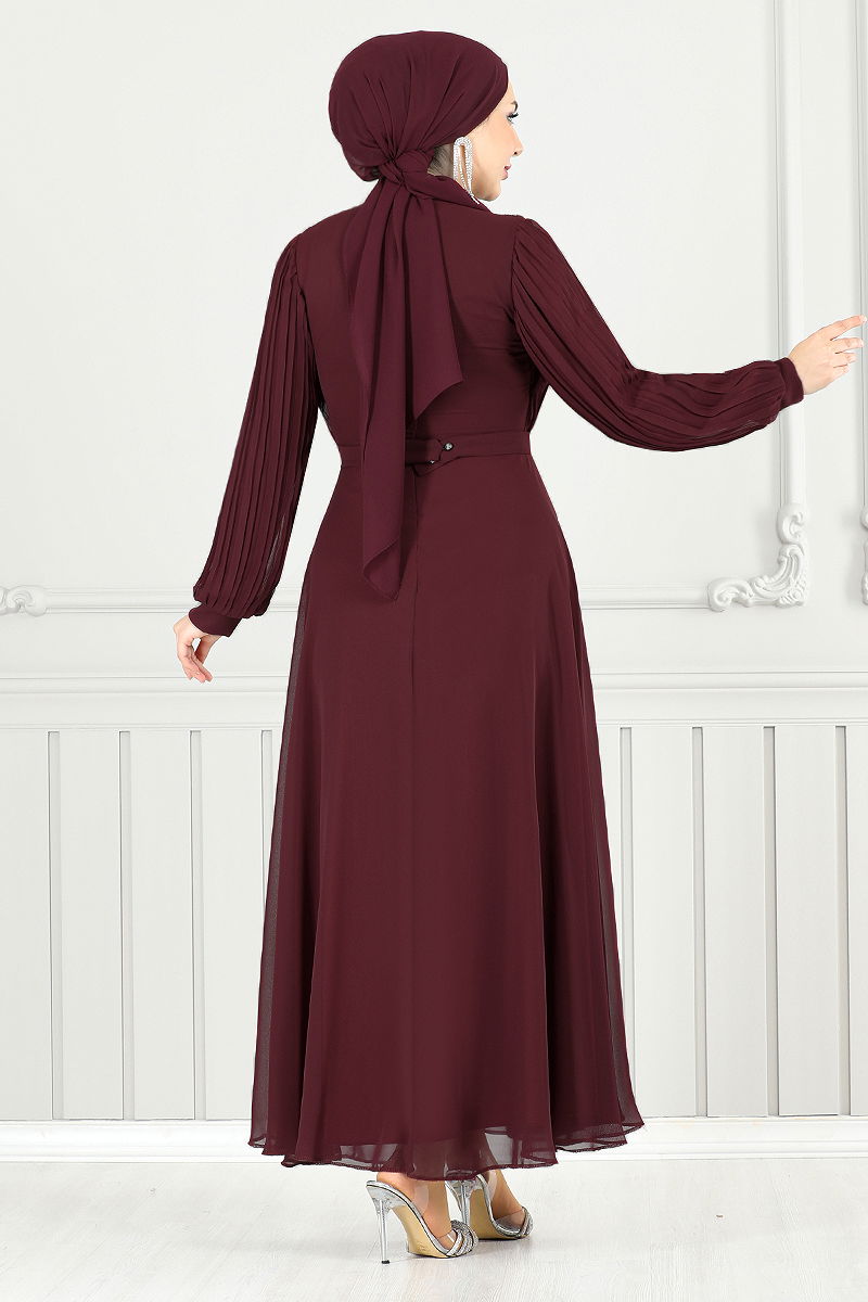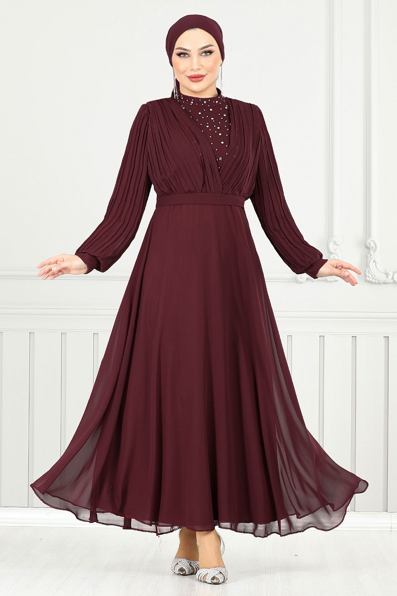 Elegance meets comfort with the Drape Detail Beaded Evening Dress, making you stand out at any special event throughout the year. This modest dress offers a modern and chic appearance. Made from lightweight and lined chiffon fabric, it ensures comfortable wear. The dress dazzles with pearl and gemstone details and features a zipper at the back for ease of use. The belt detail, stitched at both ends with a loose middle, adds an elegant touch and is included with the dress, offering versatile styling options. Only dry cleaning is recommended for this exquisite piece, destined to become a staple in your wardrobe.