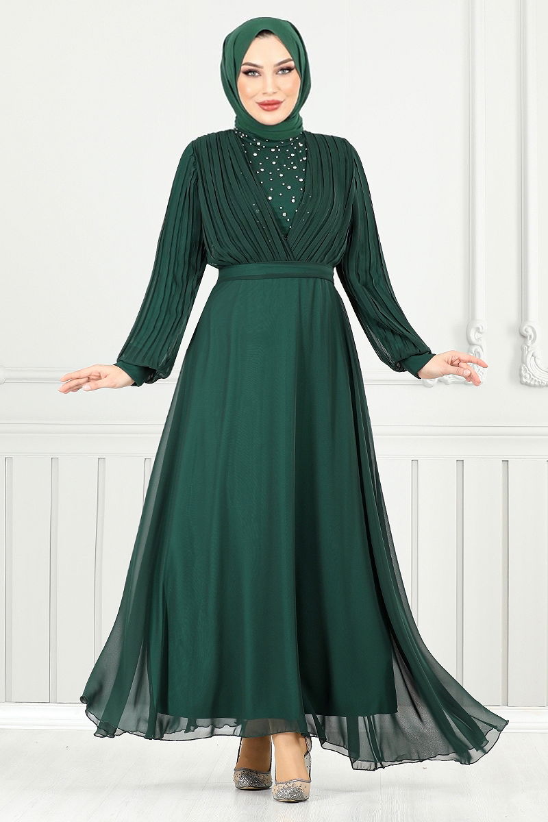 Elegance meets comfort with the Drape Detail Beaded Evening Dress, making you stand out at any special event throughout the year. This modest dress offers a modern and chic appearance. Made from lightweight and lined chiffon fabric, it ensures comfortable wear. The dress dazzles with pearl and gemstone details and features a zipper at the back for ease of use. The belt detail, stitched at both ends with a loose middle, adds an elegant touch and is included with the dress, offering versatile styling options. Only dry cleaning is recommended for this exquisite piece, destined to become a staple in your wardrobe.