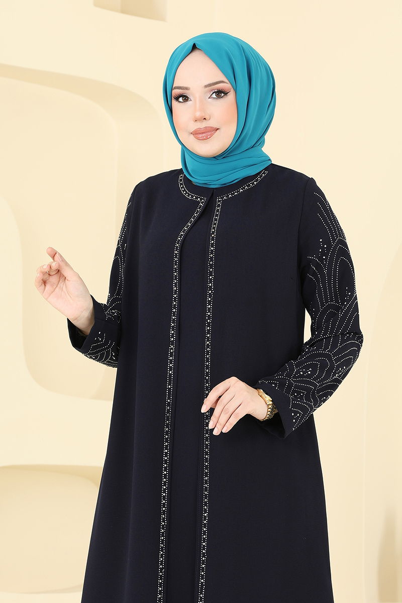 Elegantly complete your modest fashion with this Stone Beaded Honeycomb Fabric Evening Dress. Perfect for all seasons, this dress will make you shine on your special occasions. Featuring a bicycle neckline and a zipper at the back, this model offers a modern touch, while its lining-free design ensures a light and comfortable fit. The stones are adhesive and the cardigan is sewn into the dress. This special item, which should be cleaned by dry cleaning only, will hold a special place in your wardrobe.