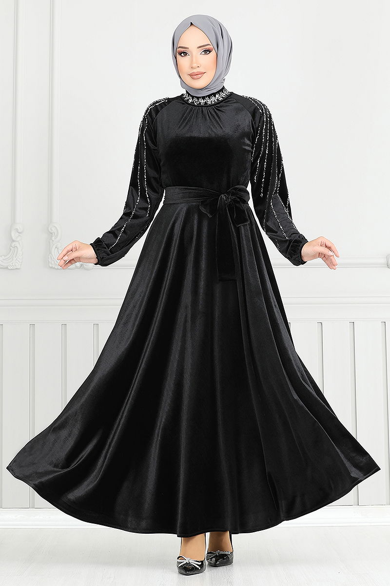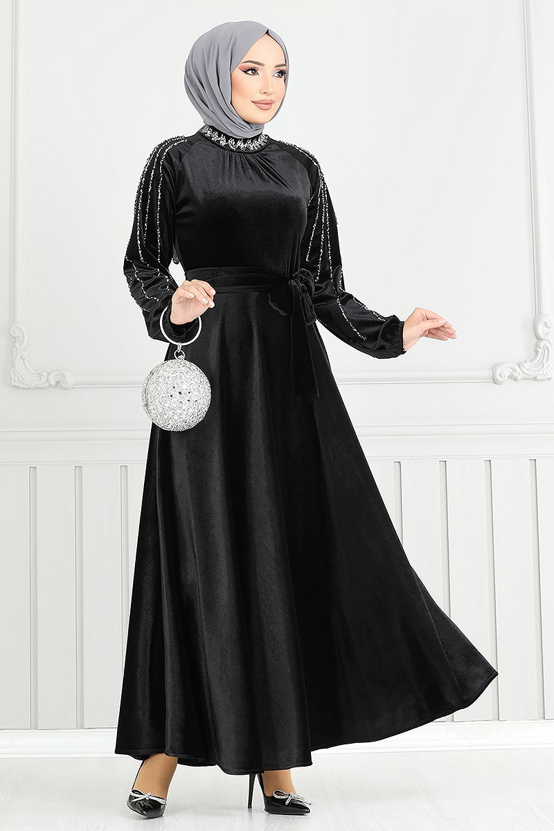 Stone-embellished Velvet Evening Dress is a model for hijab clothing. It can be used in the Autumn and Winter seasons. Dry cleaning only. It is made of velvet fabric. The product has a Half Judge collar. It is unlined. (The product on the model is size 38.) Both ends of the belt are sewn to prevent fluttering, and the middle part is left empty (seamless). The belt is included with the product and can be optionally used. Stones are glued.