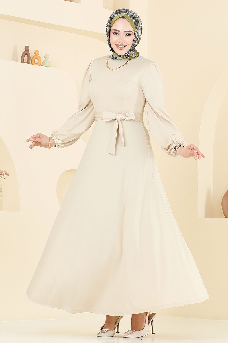 Combining elegance and comfort, the Belted Evening Dress can be comfortably worn in all seasons. This dress, which stands out with its hijab design, can be washed delicately at 30 degrees. Made from scuba fabric, this model offers a modern look with its crew neck and unlined design. The design with a zipper at the back and a stitched waist part provides a perfect fit. The belt that comes with the dress is optional and can be used as desired; it is stitched at both ends with the middle part left unstitched, preventing any waviness. The elastic cuffs ensure comfortable wear.