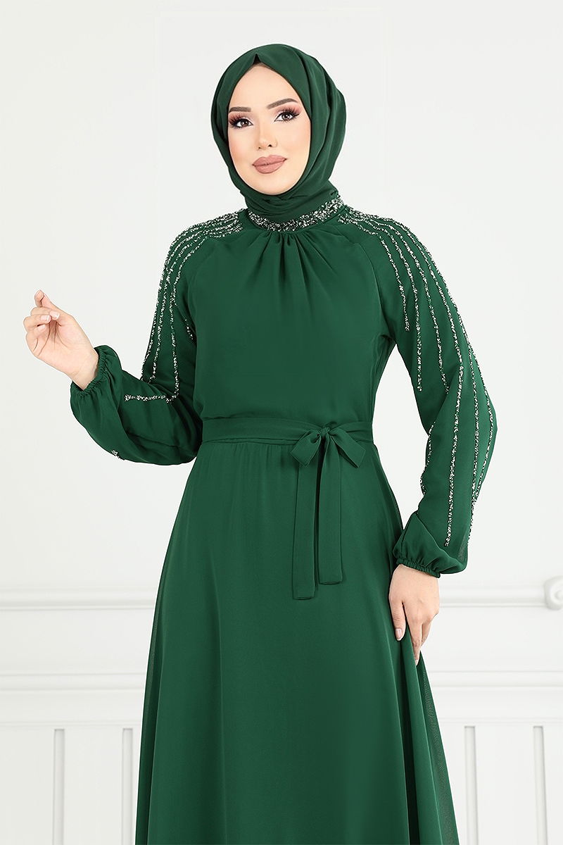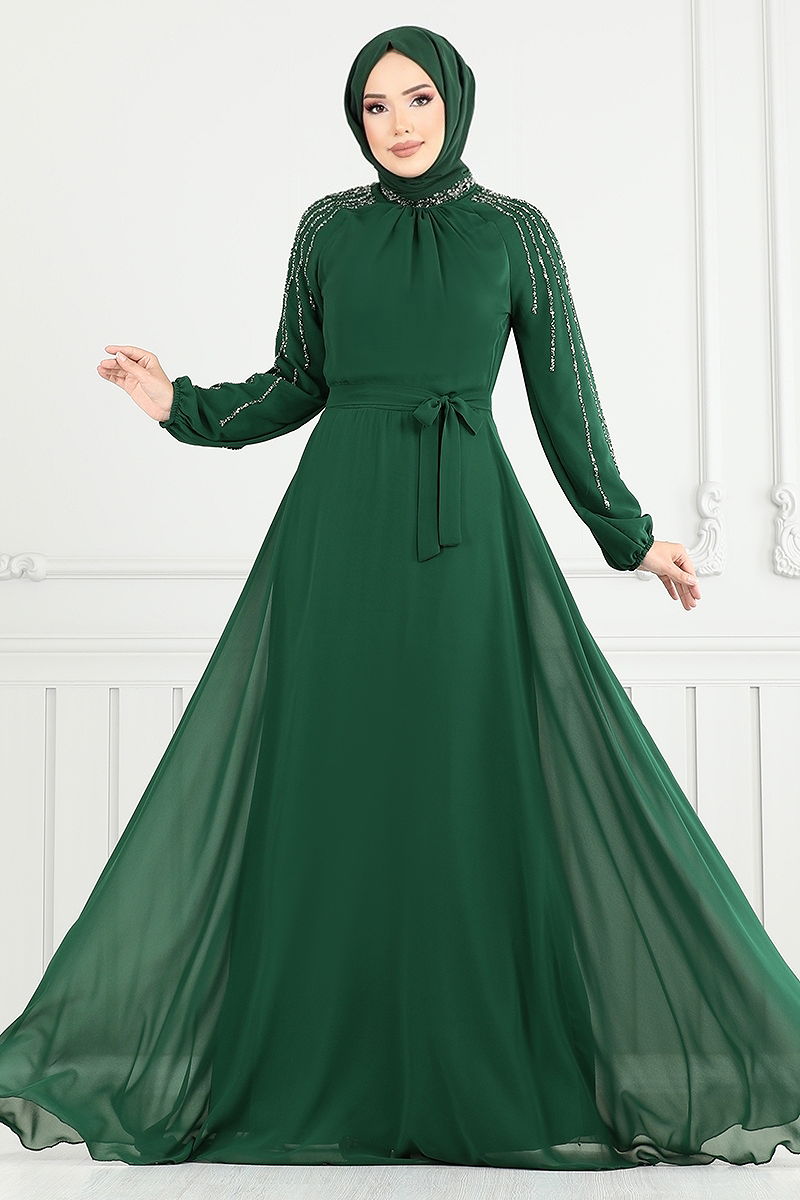 Step into any special occasion with the radiant Jeweled Sleeve Chiffon Gown, an epitome of elegance and style suited for any season. This modest gown is crafted from chiffon fabric and features a mandarin collar that enhances its sophisticated appeal. It is fully lined and designed with a zipper at the back. A chic belt at the waist adds a touch of finesse, while the elastic cuffs provide comfort. The sleeves are embellished with jewels, and the gown should only be dry cleaned. Displayed model is in size 38; other sizes are available. Opt for this gown for weddings, engagements, or significant dinners to showcase your elegance.