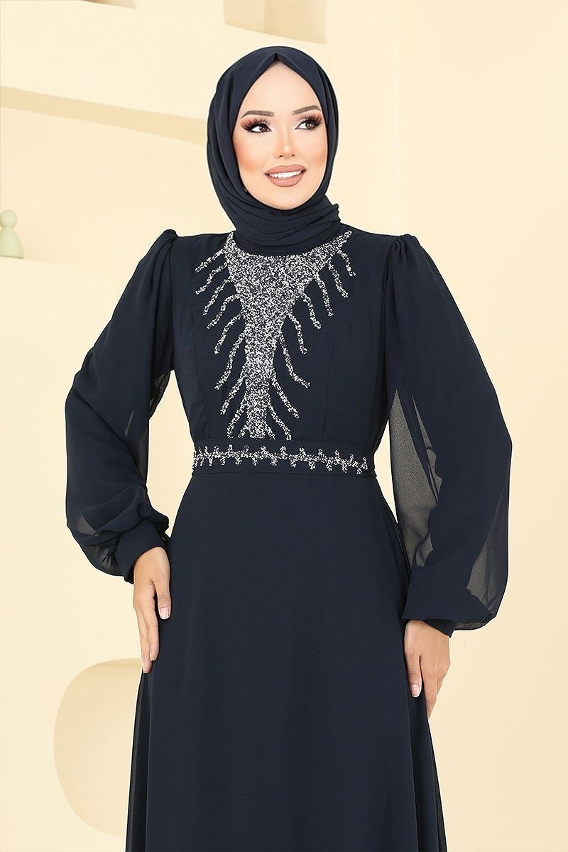 The Front Stone Chiffon Evening Dress represents elegance for your special occasions. Suitable for all seasons, this modest evening dress should only be dry cleaned. Made of chiffon fabric and lined, it offers both comfort and style with its high-neck halter design and zipper at the back. The stones on the model are pasted, and its belted design is stitched to prevent waving. The belt is included and can be optionally detached.