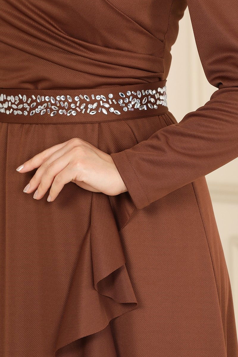 The Bead-Waist Gown is a modest model that can be worn comfortably across all seasons. This dress, which stands out with its classic and elegant appearance, will make you dazzle on your special days. It is made from Knit Dabıl fabric and is unlined. It offers practical use with its bike neck design and zipper closure on the back. This dress, which should only be dry cleaned, is embellished with bead details. (The product on the model is a size 38. Height: 160 cm, Chest: 86 cm, Waist: 68 cm, Hip: 95 cm, Weight: 55 kg.)