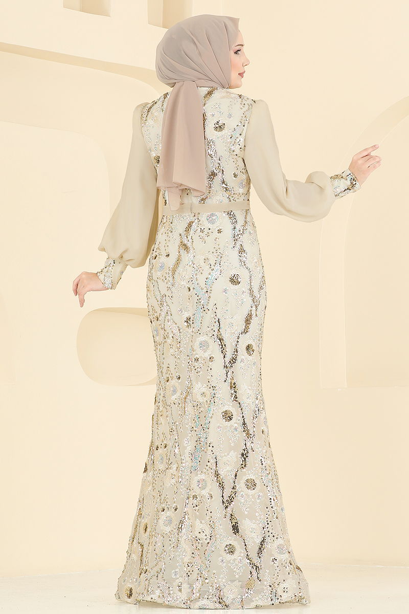 The Sequin Detail Evening Dress is an all-season compatible modest wear piece. Made from chiffon and sequins, this dress ensures an elegant and refined appearance. Only suitable for dry cleaning, it is lined and features a back zipper for easy wear. The bike neck design adds a modern twist, while built-in chest pads offer extra comfort. The sequin details provide a sophisticated touch, although their colors may vary slightly, contributing to the uniqueness of each dress. It also has a sewn-in belt at the waist.