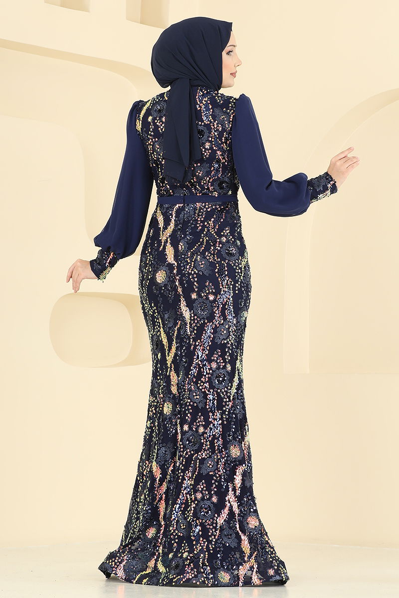 The Sequin Detail Evening Dress is an all-season compatible modest wear piece. Made from chiffon and sequins, this dress ensures an elegant and refined appearance. Only suitable for dry cleaning, it is lined and features a back zipper for easy wear. The bike neck design adds a modern twist, while built-in chest pads offer extra comfort. The sequin details provide a sophisticated touch, although their colors may vary slightly, contributing to the uniqueness of each dress. It also has a sewn-in belt at the waist.