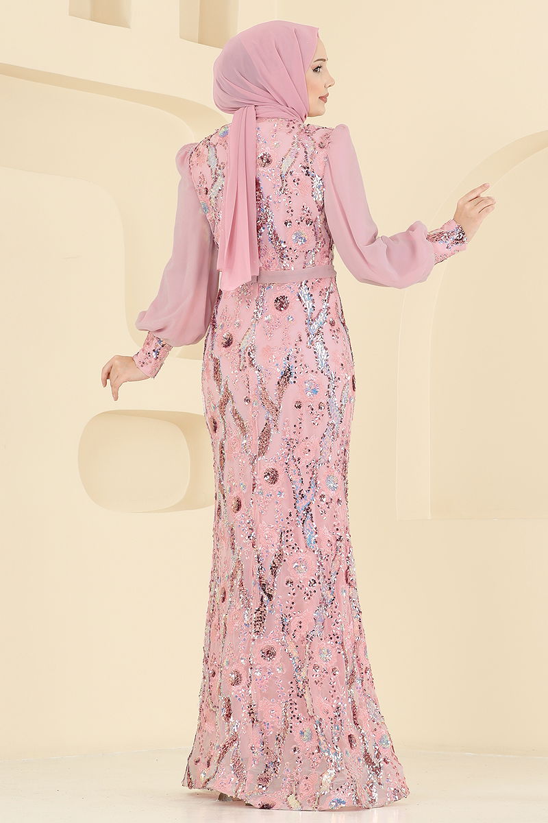 The Sequin Detail Evening Dress is an all-season compatible modest wear piece. Made from chiffon and sequins, this dress ensures an elegant and refined appearance. Only suitable for dry cleaning, it is lined and features a back zipper for easy wear. The bike neck design adds a modern twist, while built-in chest pads offer extra comfort. The sequin details provide a sophisticated touch, although their colors may vary slightly, contributing to the uniqueness of each dress. It also has a sewn-in belt at the waist.