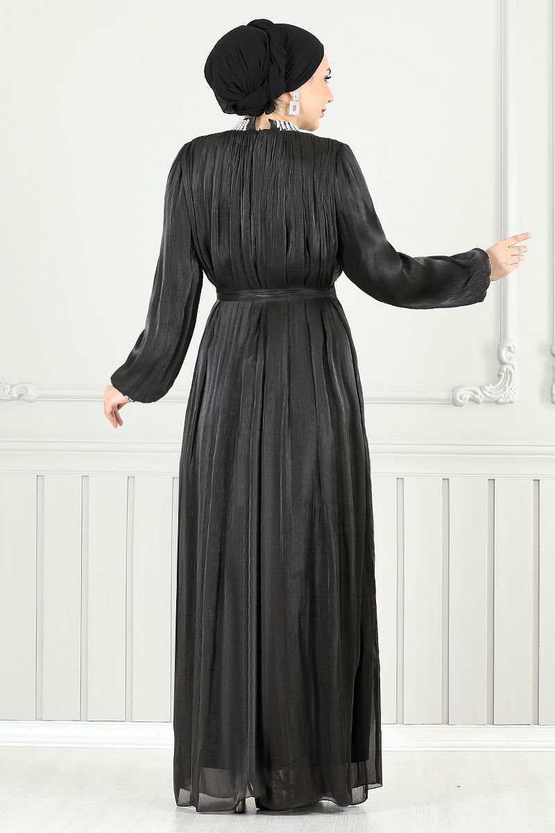 Embodying elegance and sophistication, the Pearl-Collared Evening Dress is a stunning choice for conservative fashion. Suitable for all seasons, this special design is crafted from shiny fabric that requires dry cleaning only. Its distinguished mandarin collar and detailed pearl embellishments make this gown a standout piece; it also features a lined structure and a back zipper for both comfort and style. The belt detail is specially stitched to prevent wavering and can be optionally removed. Displayed on a size 38 model, this evening dress promises an exquisite appearance for any special occasion.