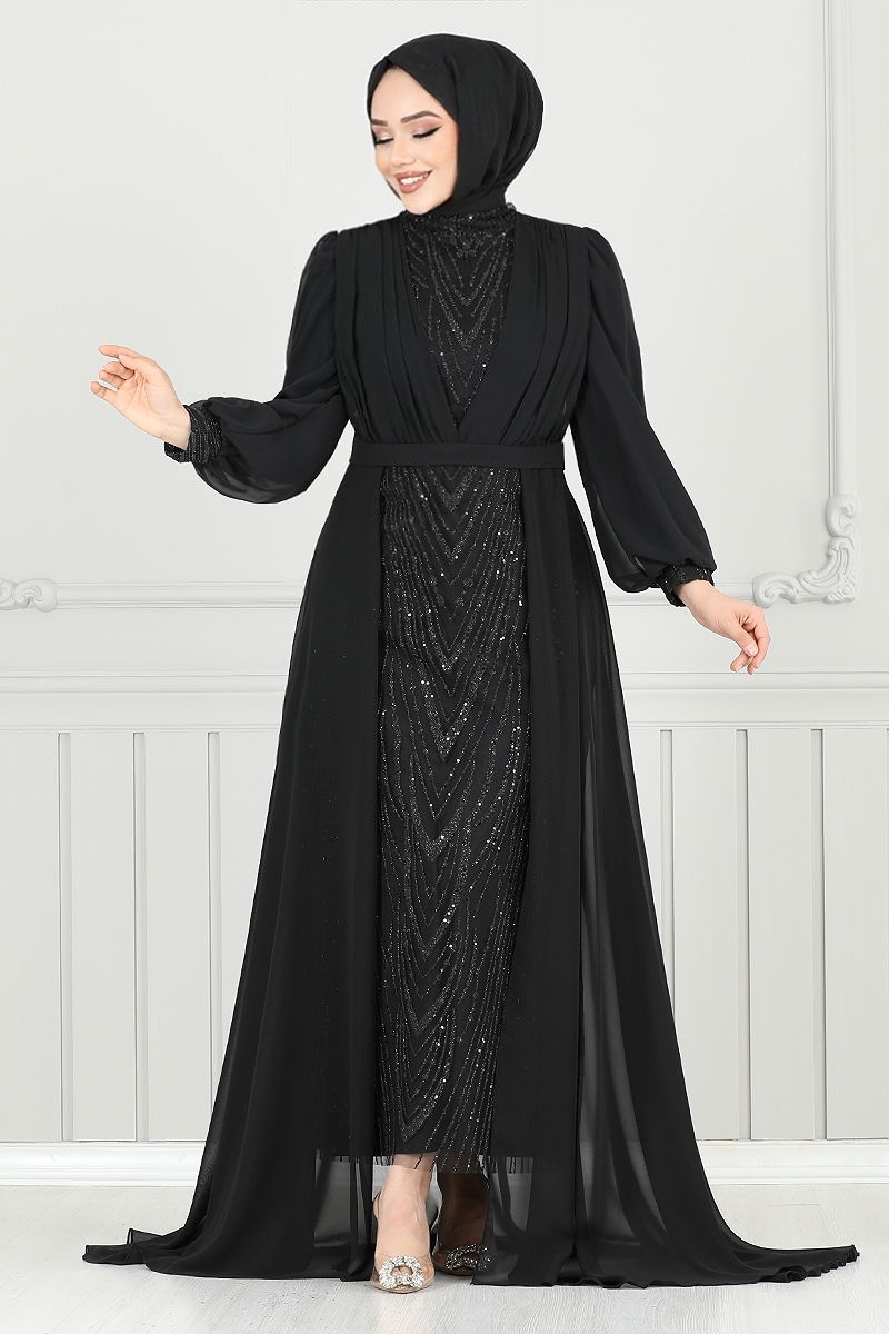 The Cape Detailed Evening Dress with Sequins combines elegance and modesty in a hijab dress design. Suitable for all four seasons, this dress is made from chiffon fabric, giving it a light and flowing feel. The semi podium collar adds a modern touch, while the lined design ensures comfort. The back zipper makes it convenient to wear. The sequin details provide a dazzling effect that will catch all eyes on your special occasions. Note: The product on the model is size 38, and excess sequins may shed. Should be dry cleaned only.