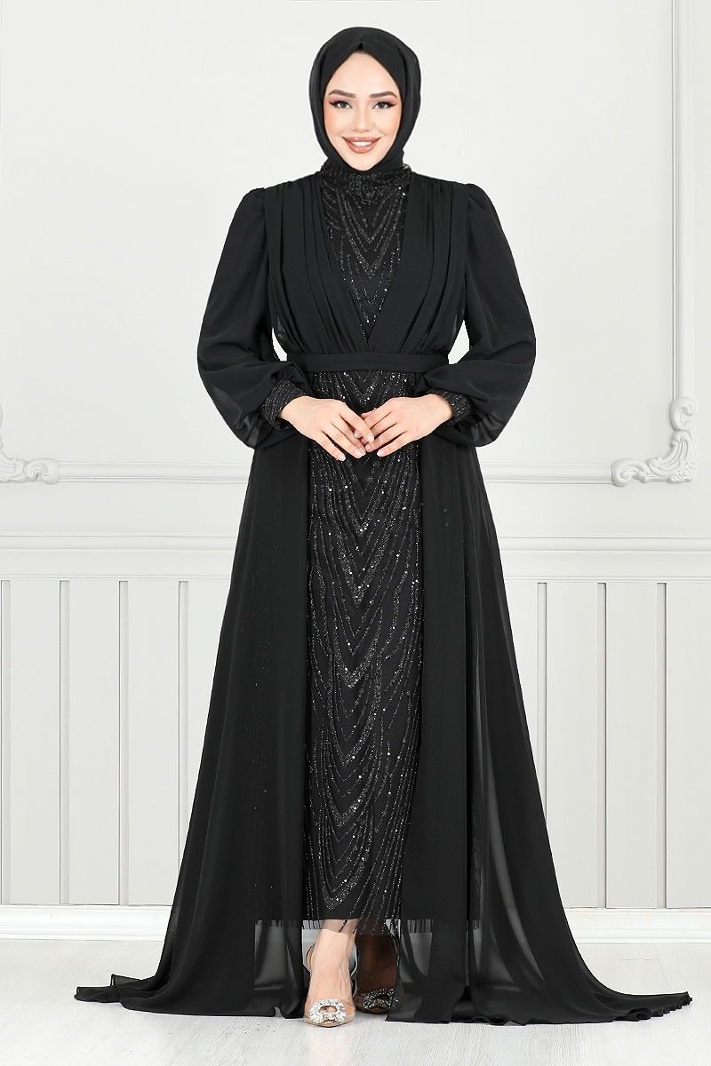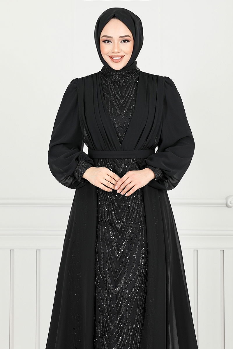 المنتج لديه ياقة نصف بيضوية. مبطنة. المنتج به سحاب في جزء من الخلف. تم صناعة القماش من القطع اللامعة . قد تتساقط مع الاستخدام رداء شيفون مخيط بتفاصيل من الشيفون. قد يكون هناك اختلاف في الدرجة اللونية في المنتج بسبب التقاط الصور الفوتوغرافية.