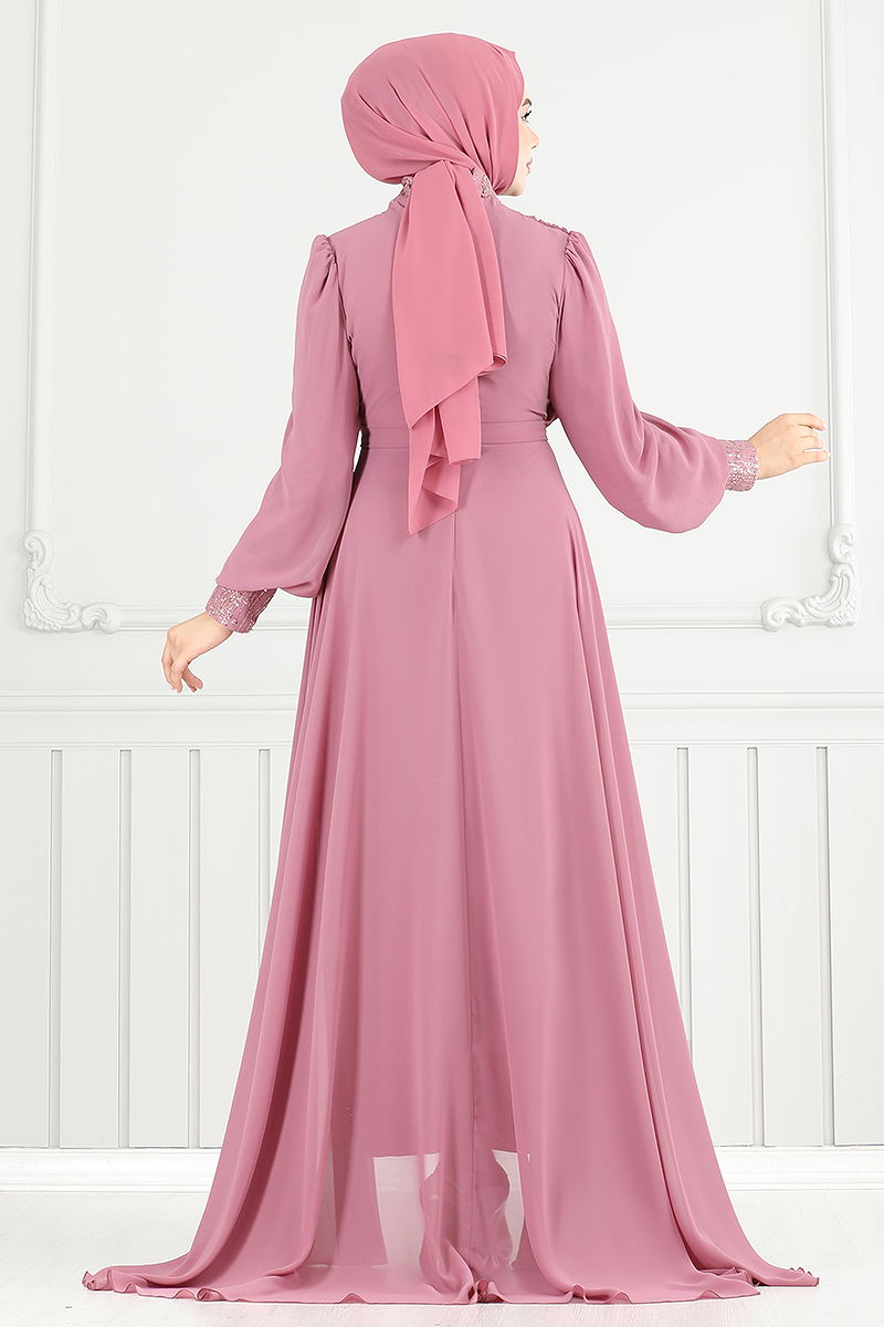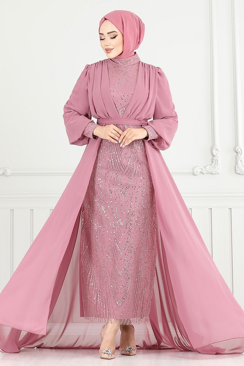 The Cape Detailed Evening Dress with Sequins combines elegance and modesty in a hijab dress design. Suitable for all four seasons, this dress is made from chiffon fabric, giving it a light and flowing feel. The semi podium collar adds a modern touch, while the lined design ensures comfort. The back zipper makes it convenient to wear. The sequin details provide a dazzling effect that will catch all eyes on your special occasions. Note: The product on the model is size 38, and excess sequins may shed. Should be dry cleaned only.