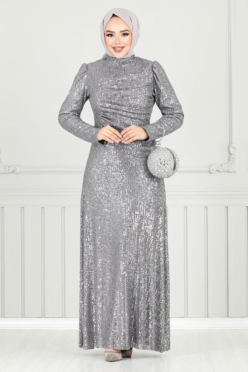 Elegant and sophisticated, the Sequin Embellished Evening Dress is perfect for your special occasions. Suitable for all seasons, this modest dress should only be dry cleaned. Dazzling with its sequin details, the dress offers comfort with its high collar and lined design. It comes with a back zipper, and the product shown is size 38.