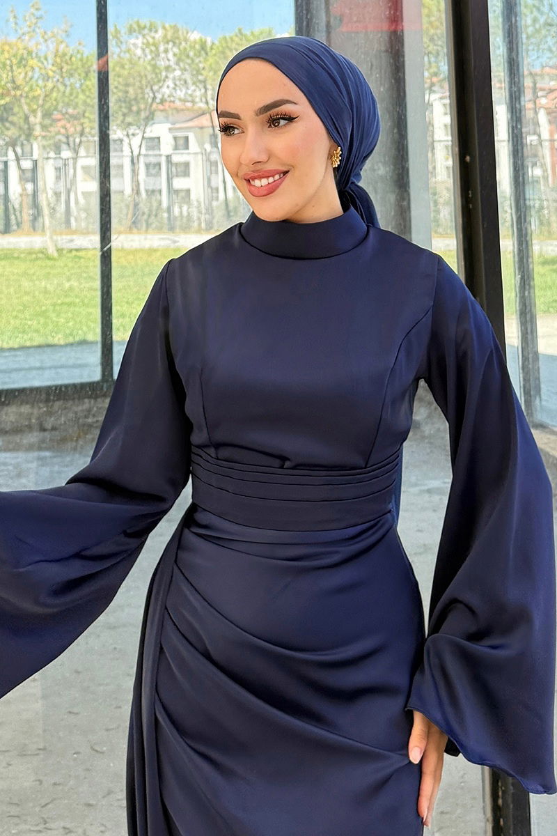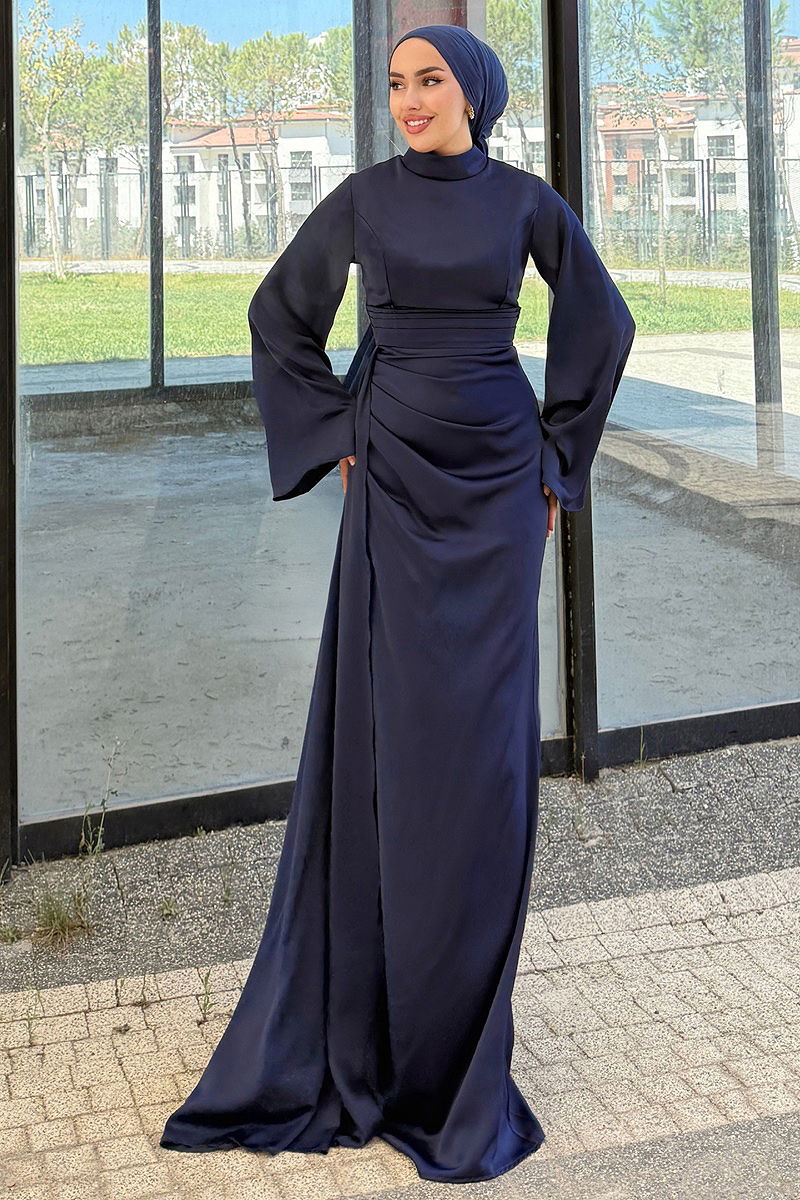 The Belted Cape Satin Evening Dress is specially designed for modest fashion. Suitable for all seasons, this exquisite dress requires only dry cleaning. The soft satin fabric adds an extra touch of elegance. Its semi-high collar and lining-free design prioritize comfort. The back zipper makes it easy to wear. With its attached belt and cape, this dress stands out, while the ruffled sleeves add a captivating detail. This product is available in size 36 and is stunning in every aspect.