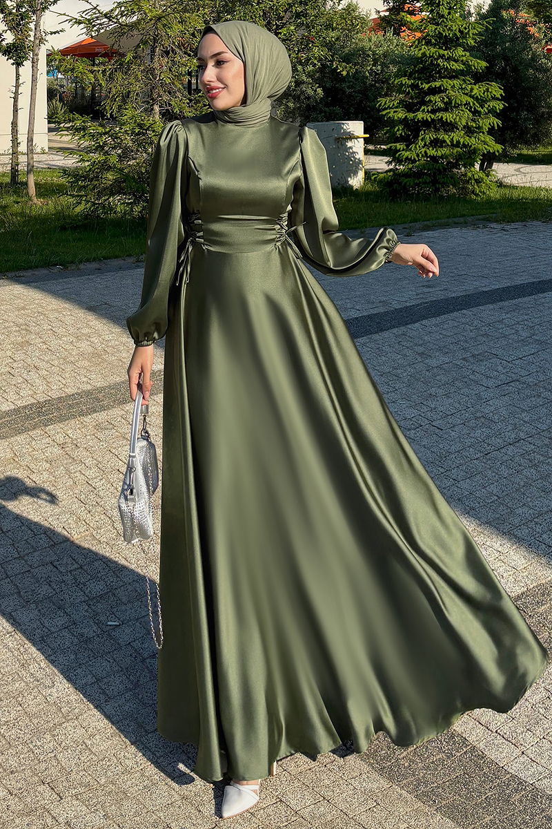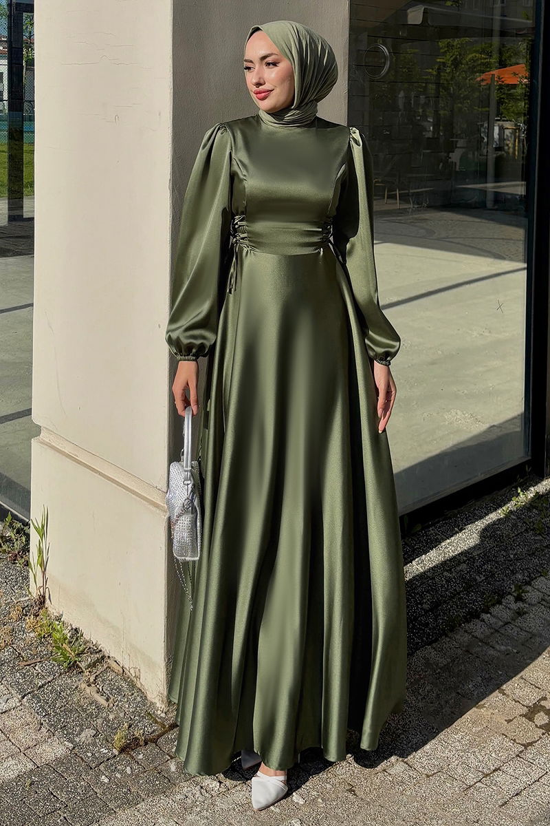 Combining elegance and comfort, the 'Drawstring Waist Satin Gown' is a perfect choice for modest wear throughout the year. Crafted from luxurious satin fabric, this dress features a bike collar and a zipped back for a contemporary look. It is unlined, with drawstring waist details to accentuate a feminine silhouette. The gown has elastic cuffs and should be only dry cleaned. An ideal choice to feel special!